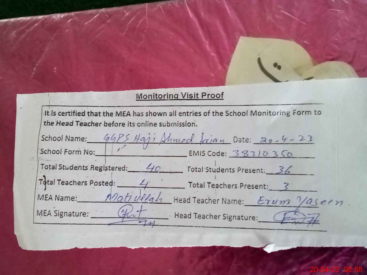 | Attendance Register | Head Teacher | MEA with School | Visit Proof |