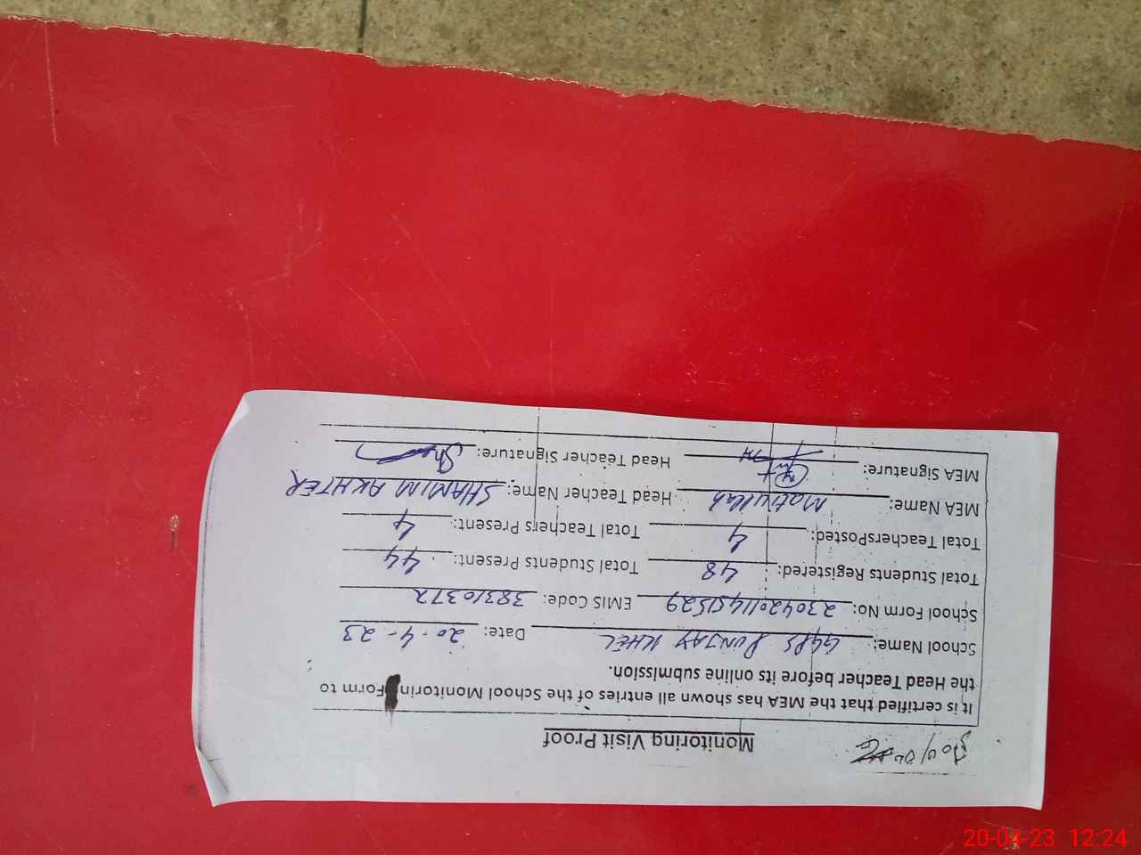 | Attendance Register | Head Teacher | MEA with School | Visit Proof |