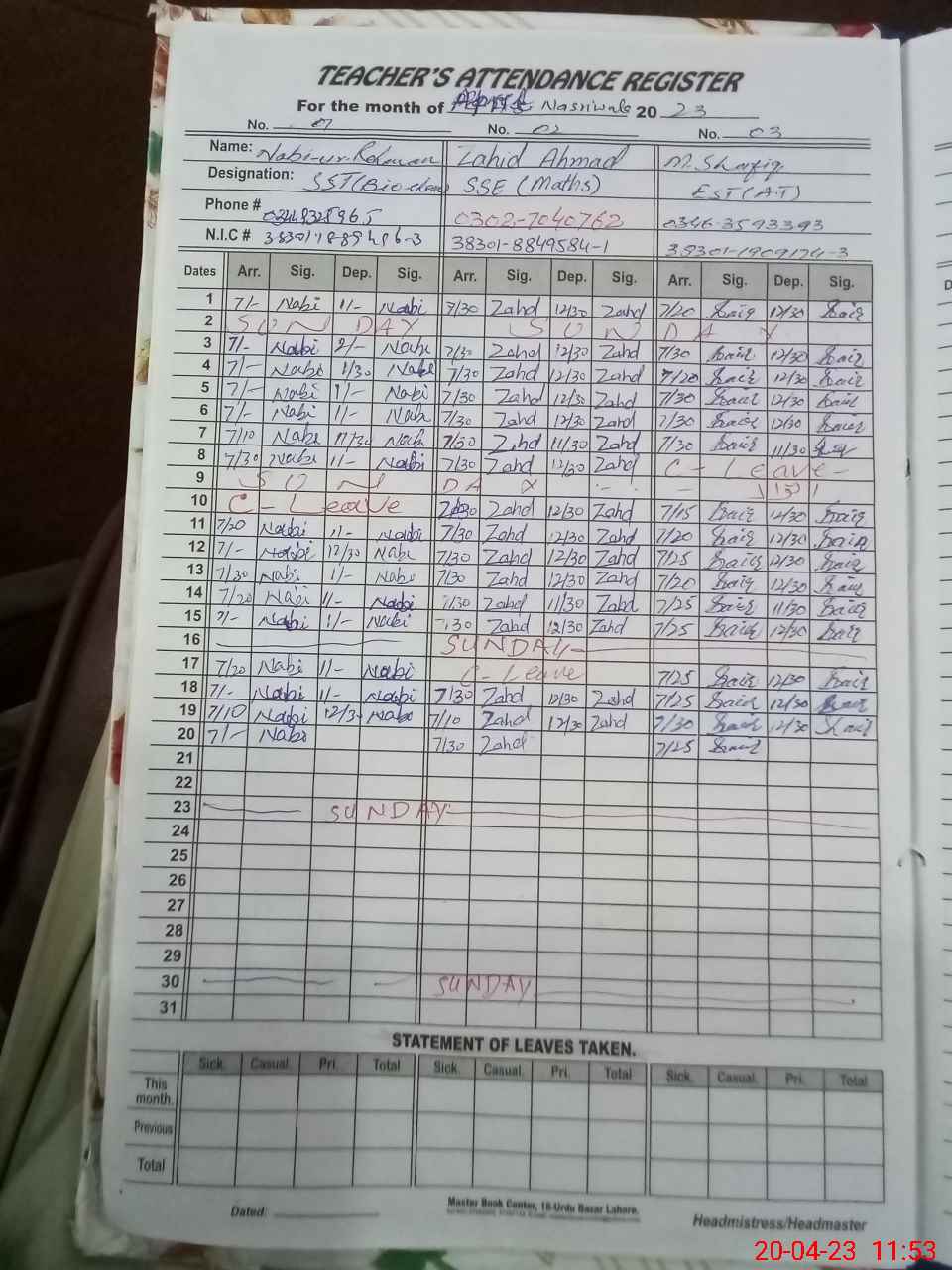 | CNIC | Full Name | Designation | R/C | Absence During Last Calender Month |