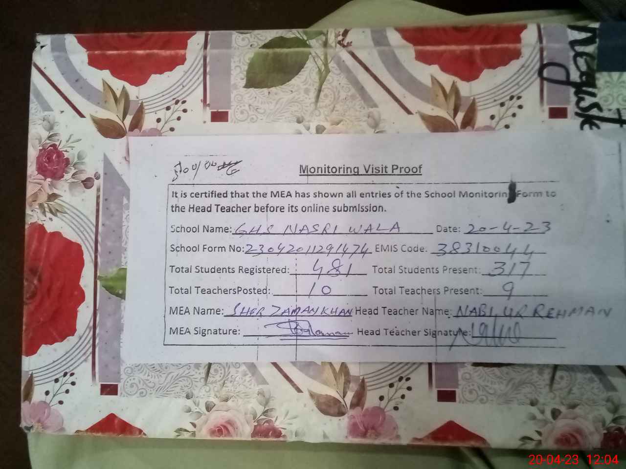 | Attendance Register | Head Teacher | MEA with School | Visit Proof |