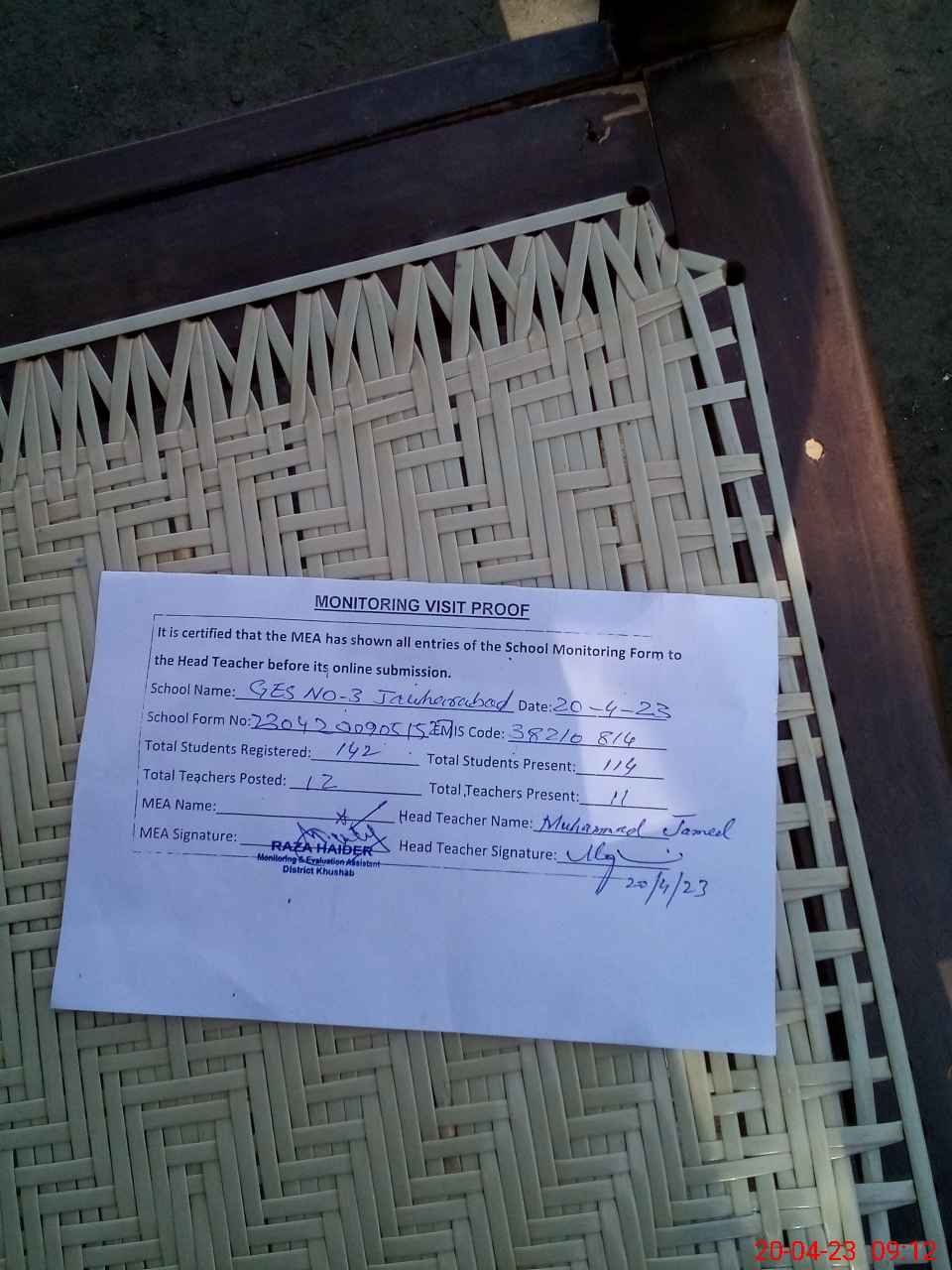| Attendance Register | Head Teacher | MEA with School | Visit Proof |