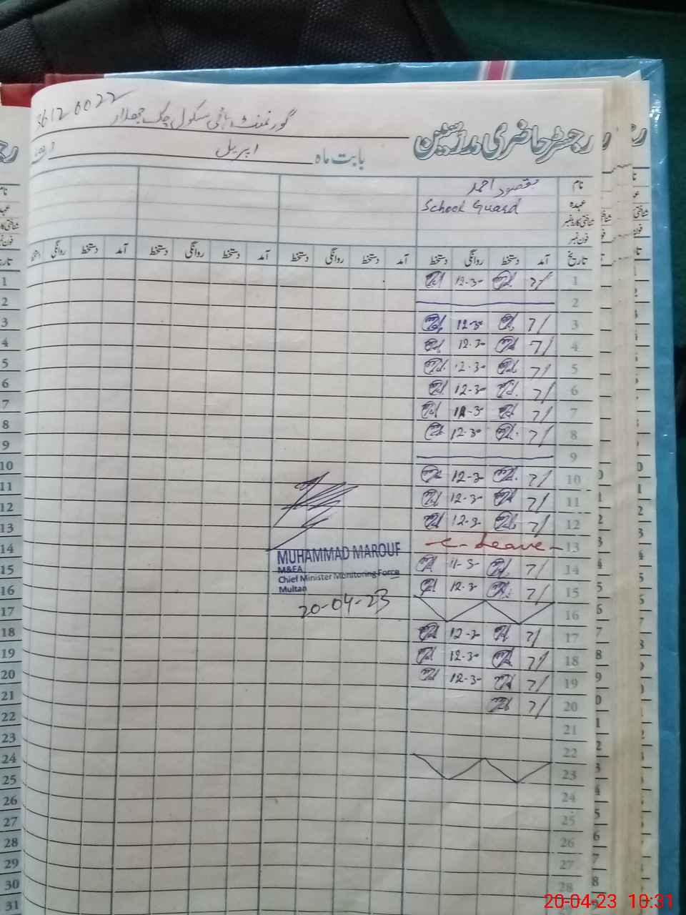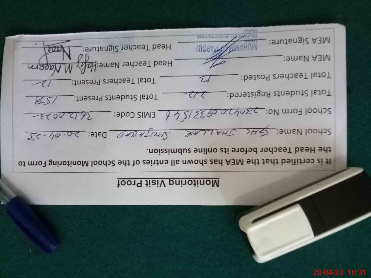 | Attendance Register | Head Teacher | MEA with School | Visit Proof |