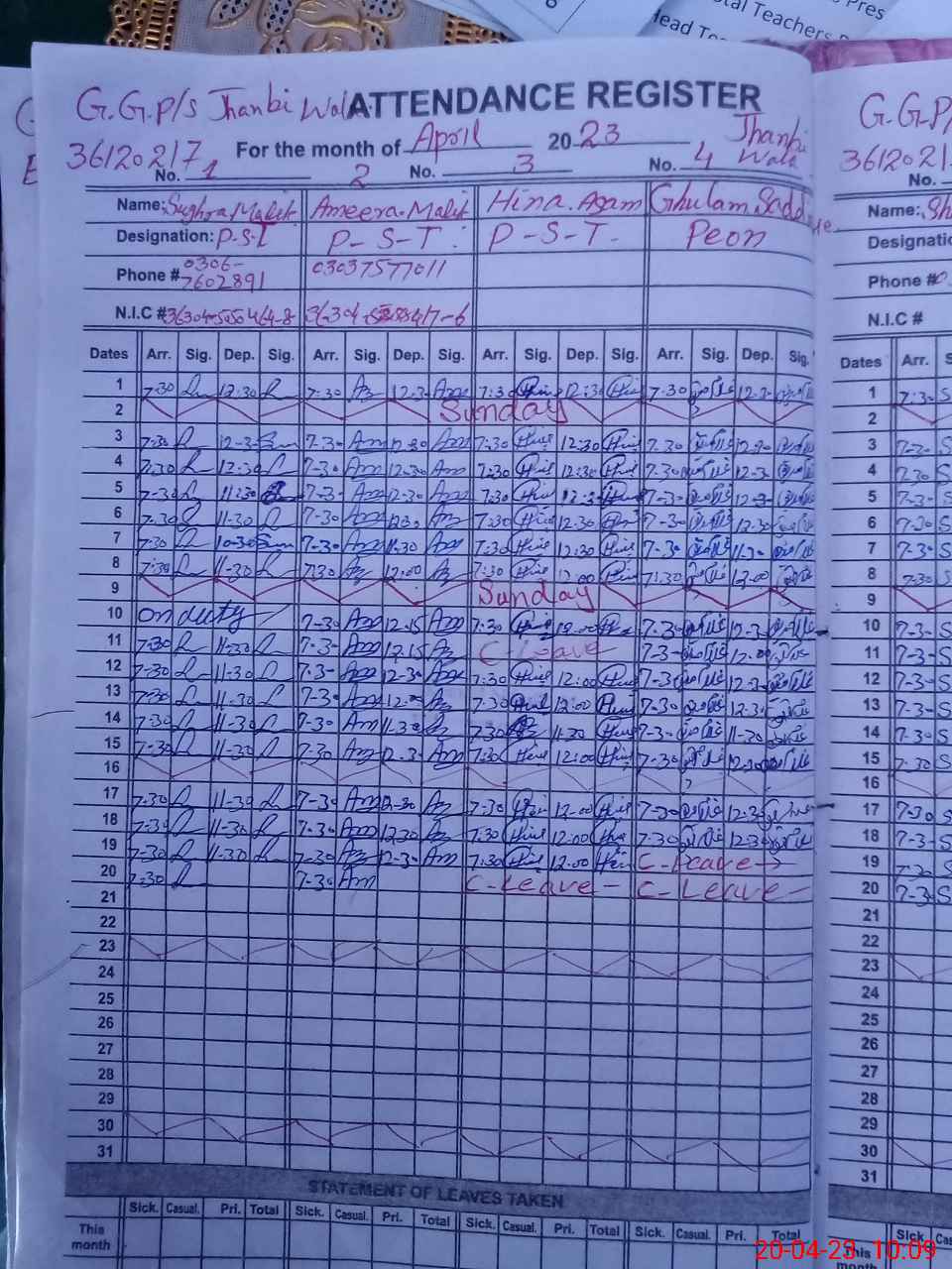 | CNIC | Full Name | Designation | R/C | Absence During Last Calender Month |