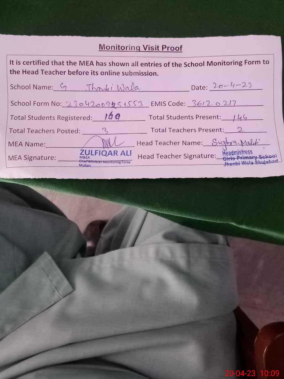 | Monitoring Date: 20-04-2023 | Start Time: 20-04-2023 09:25 AM | End Time: 20-04-2023 10:09 AM | Name of MEA: Zu**** Al**** | |