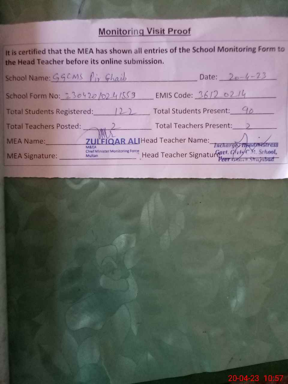 | EMIS Code: 36120214 | Name of School: GGCMS PIR GHAIB P/O SHUJABAD | |||