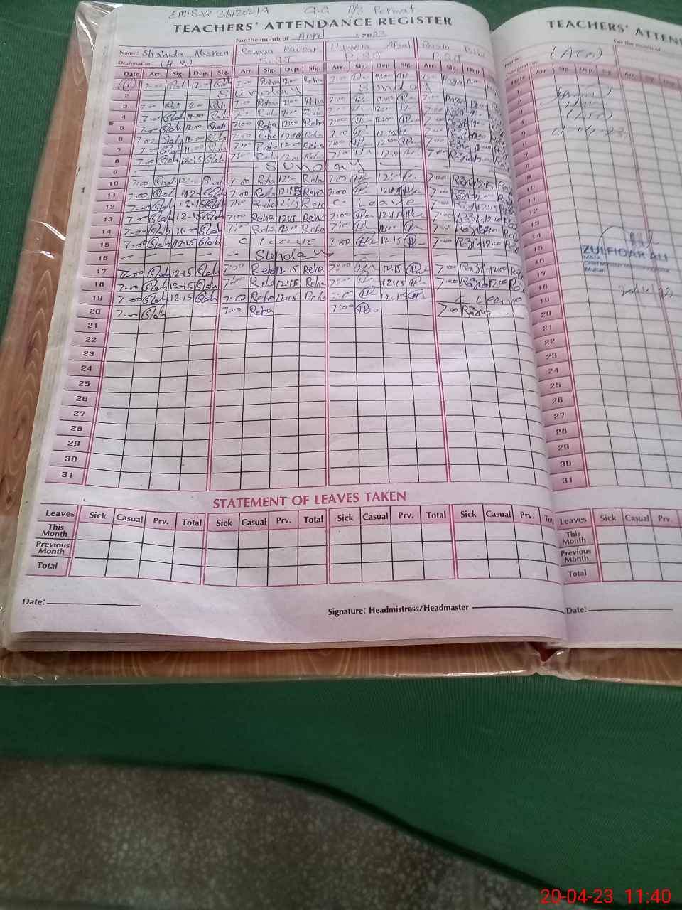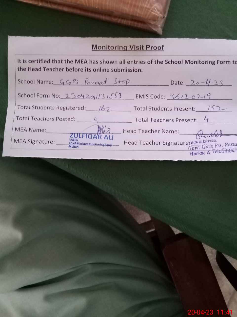 | Attendance Register | Head Teacher | MEA with School | Visit Proof |