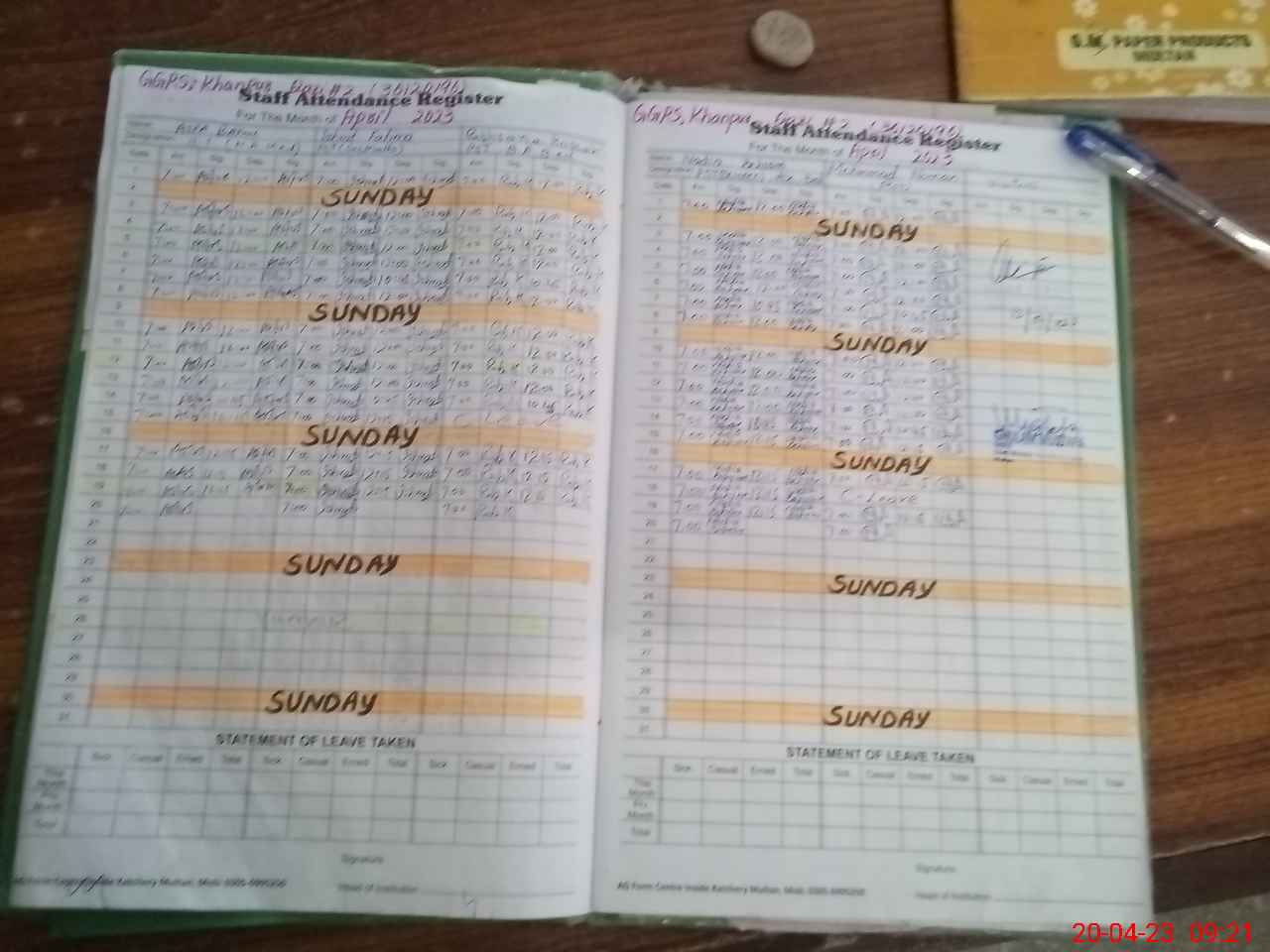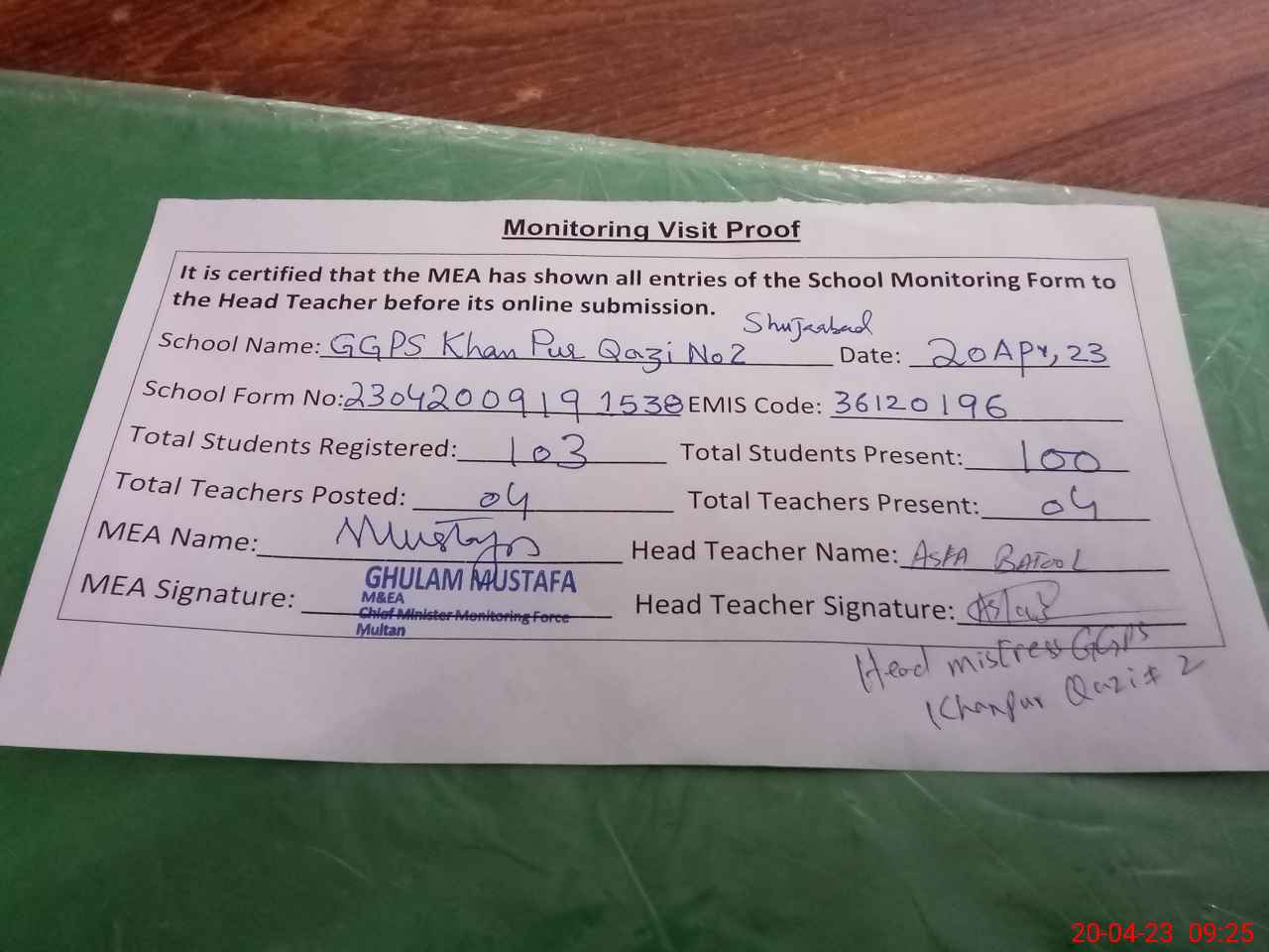 | Attendance Register | Head Teacher | MEA with School | Visit Proof |