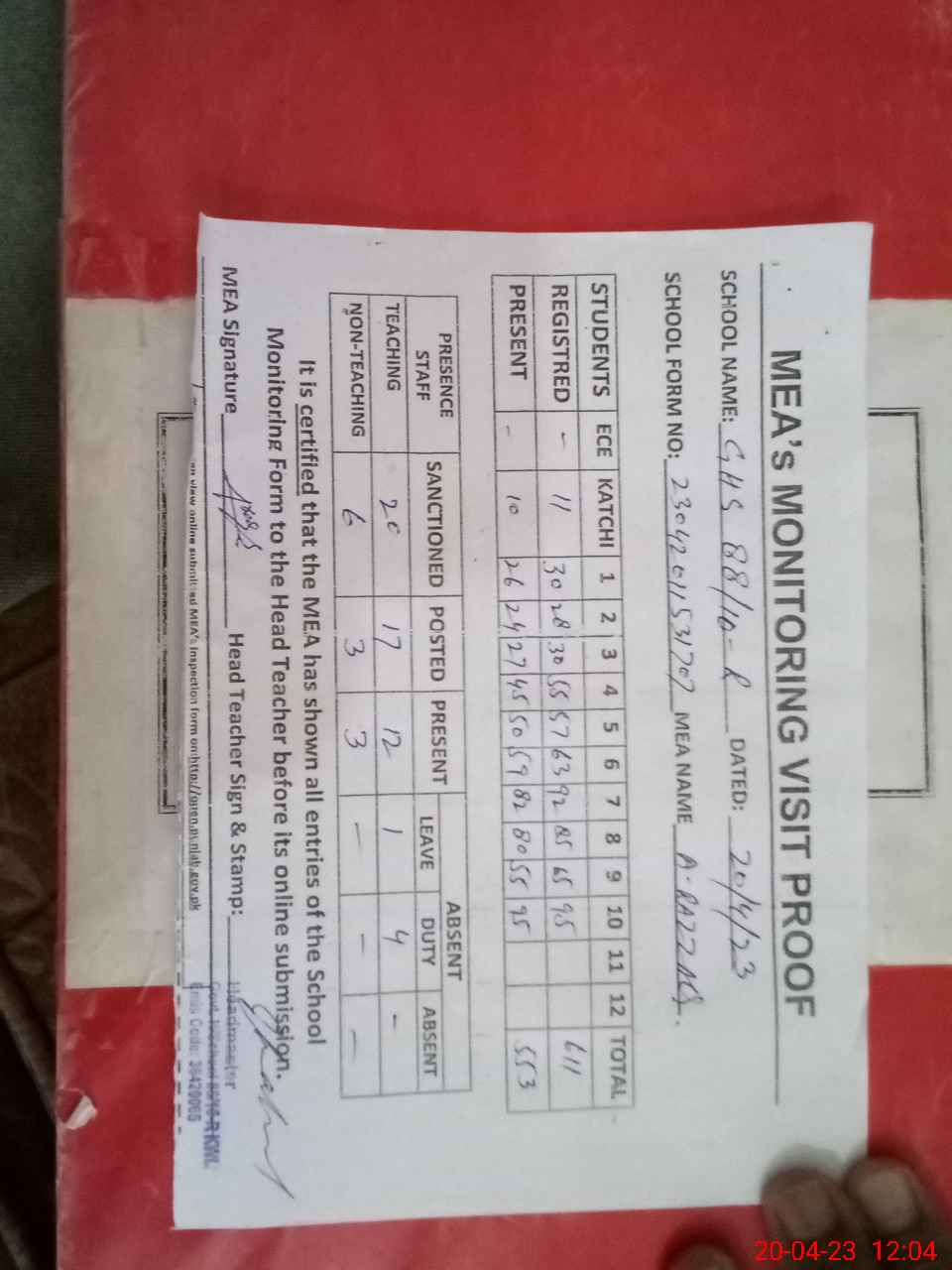 | Attendance Register | Head Teacher | MEA with School | Visit Proof |