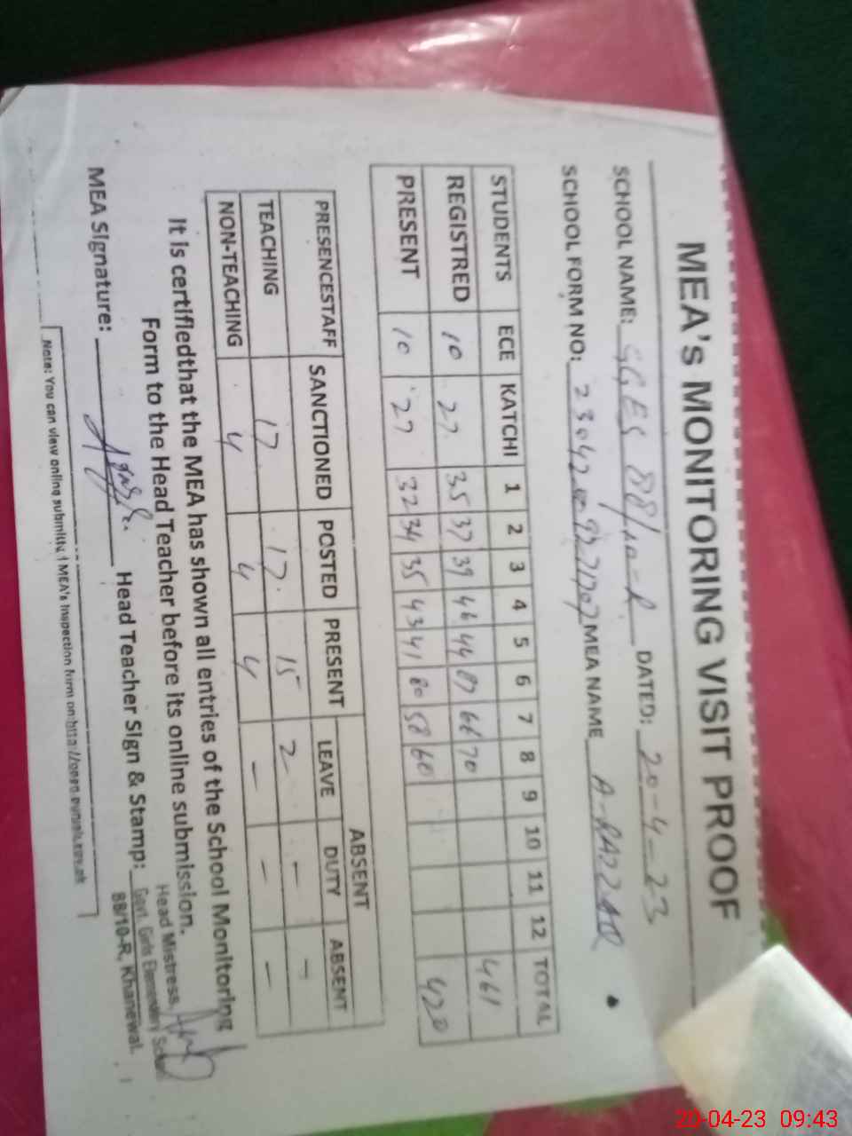 | Attendance Register | Head Teacher | MEA with School | Visit Proof |