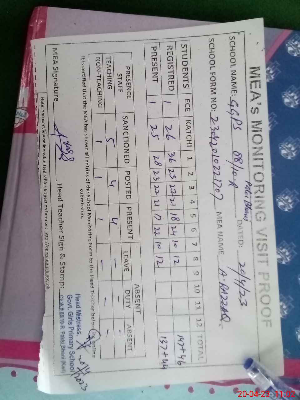 | Attendance Register | Head Teacher | MEA with School | Visit Proof |