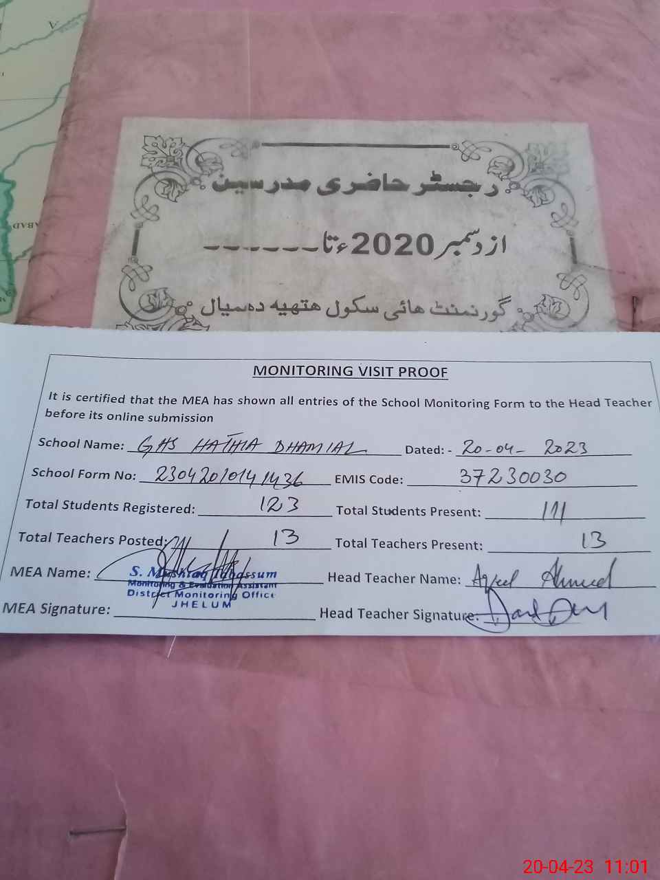 | Attendance Register | Head Teacher | MEA with School | Visit Proof |