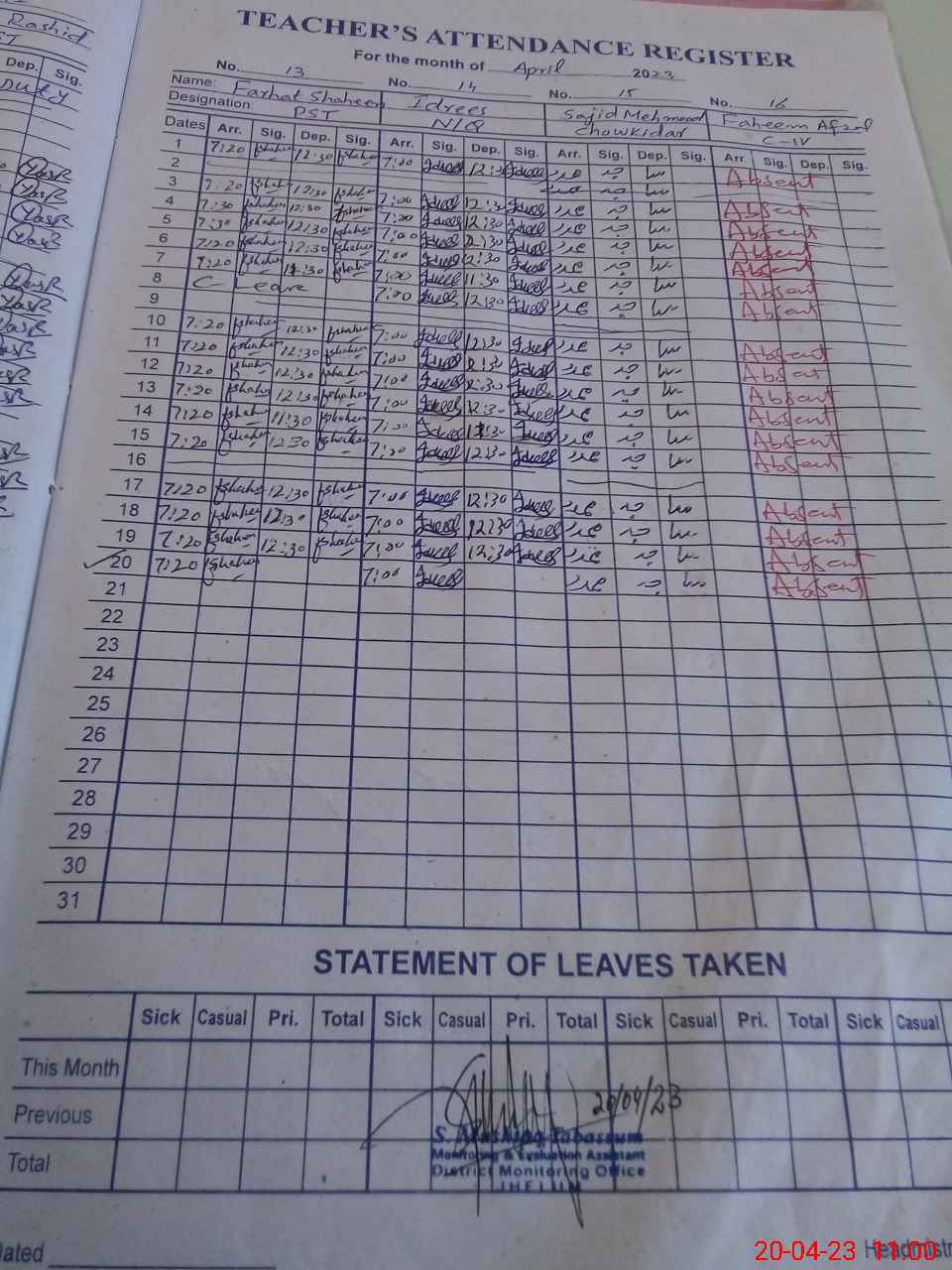 | CNIC | Full Name | Designation | R/C | Absence During Last Calender Month |