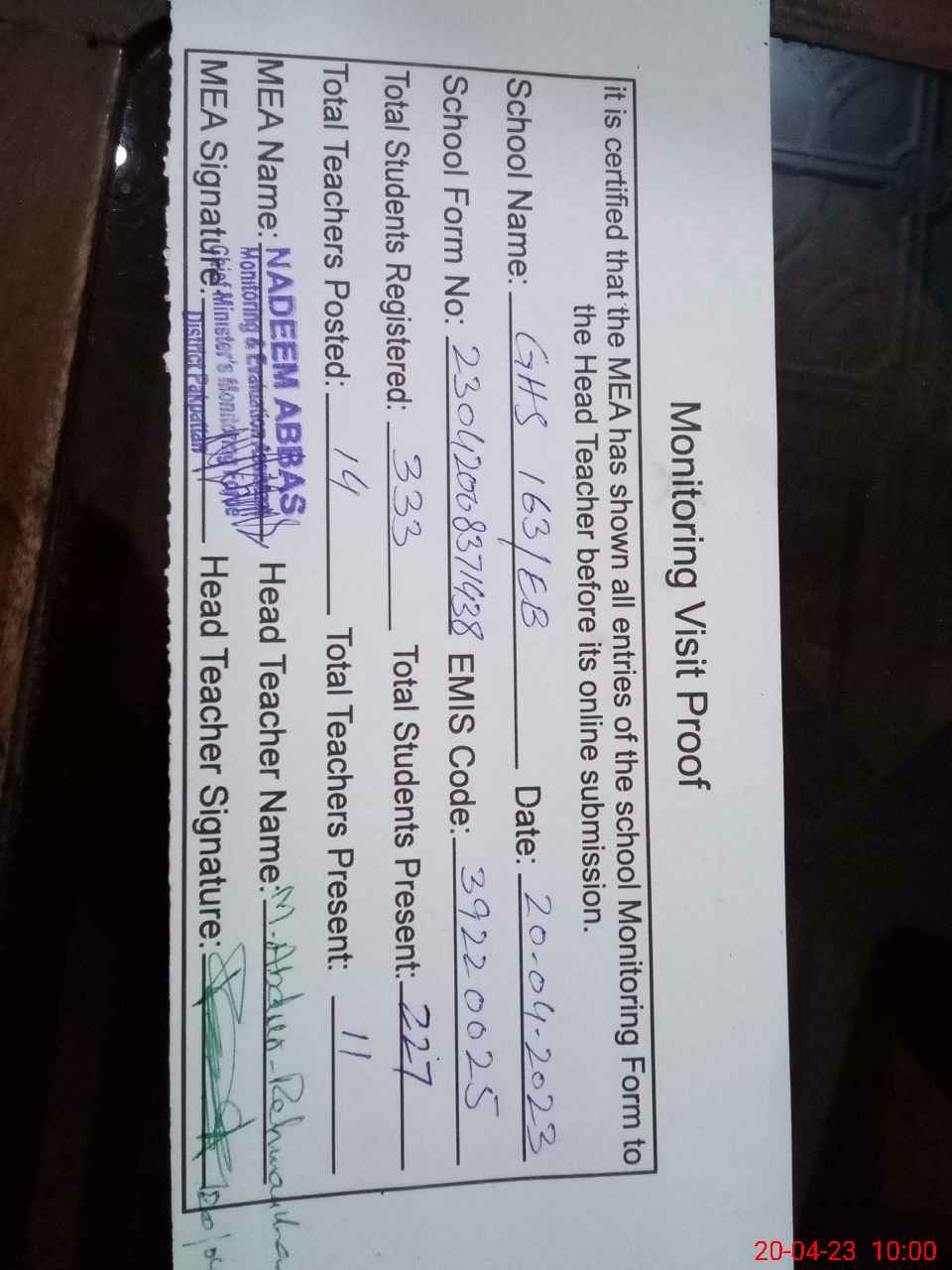 | Attendance Register | Head Teacher | MEA with School | Visit Proof |