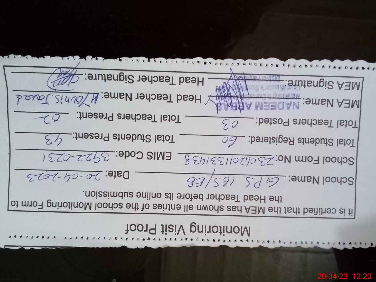 | Attendance Register | Head Teacher | MEA with School | Visit Proof |