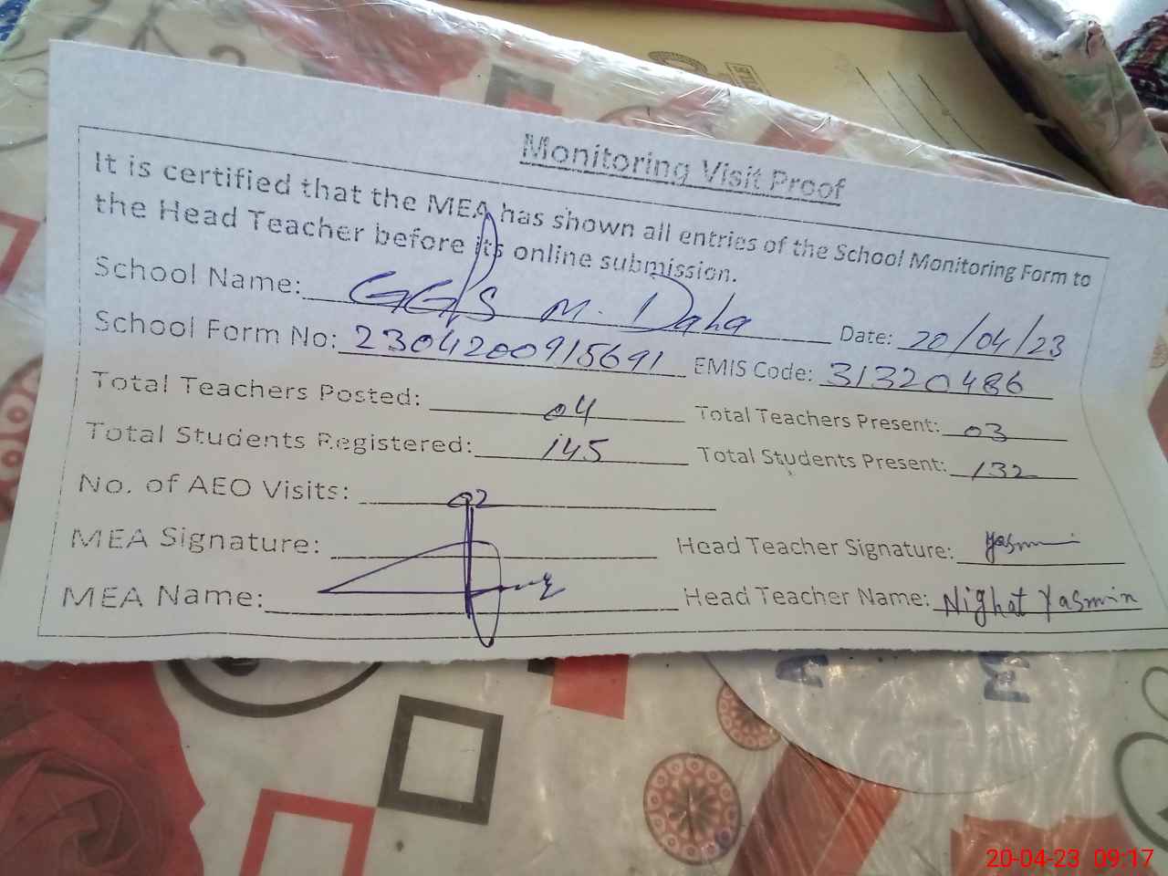 | Attendance Register | Head Teacher | MEA with School | Visit Proof |