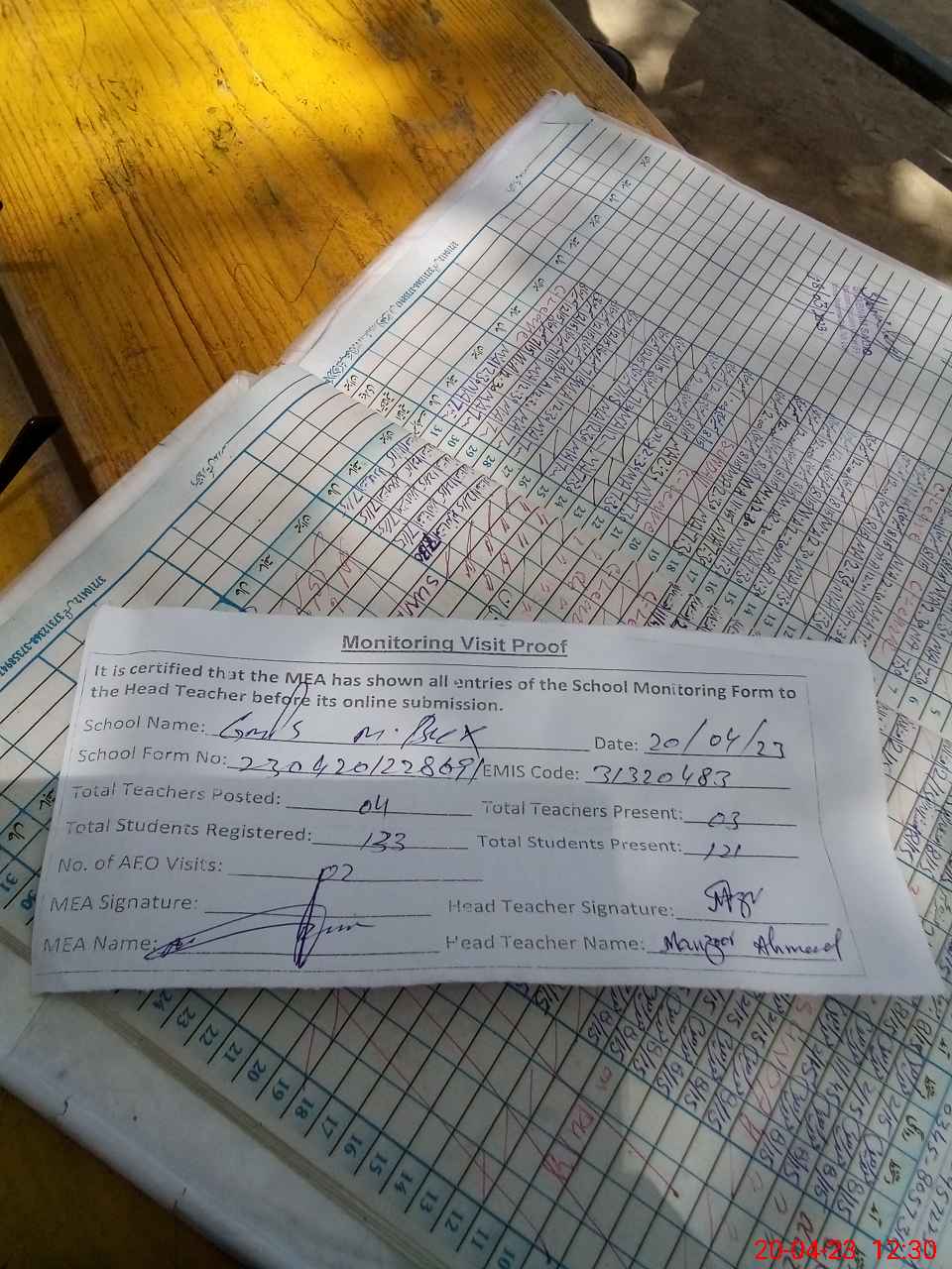 | Attendance Register | Head Teacher | MEA with School | Visit Proof |
