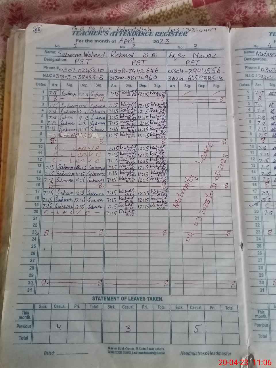 | Remarks (Use Separate Page if Required): 1 Teacher Aqsa nawaz as per register shown maternity leave but sanctioned leave not available in school Mark absent 2 teacher sabeena Waheed as per register shown c leave but on line sanctioned leave not available in school at time of visit mea Mark absent 3 NSB bank statement not available in school at time of visit mea | |||||