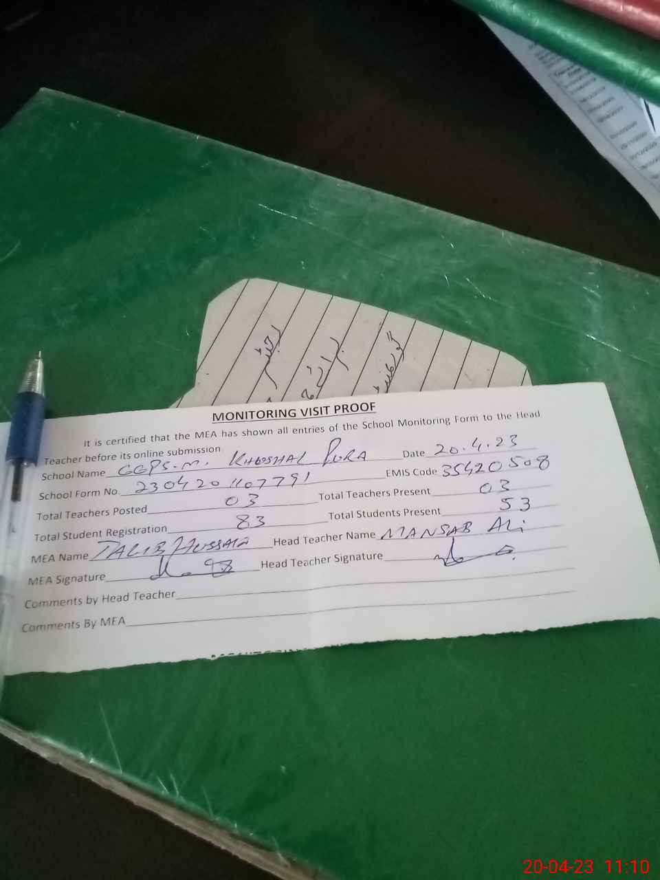 | Attendance Register | Head Teacher | MEA with School | Visit Proof |