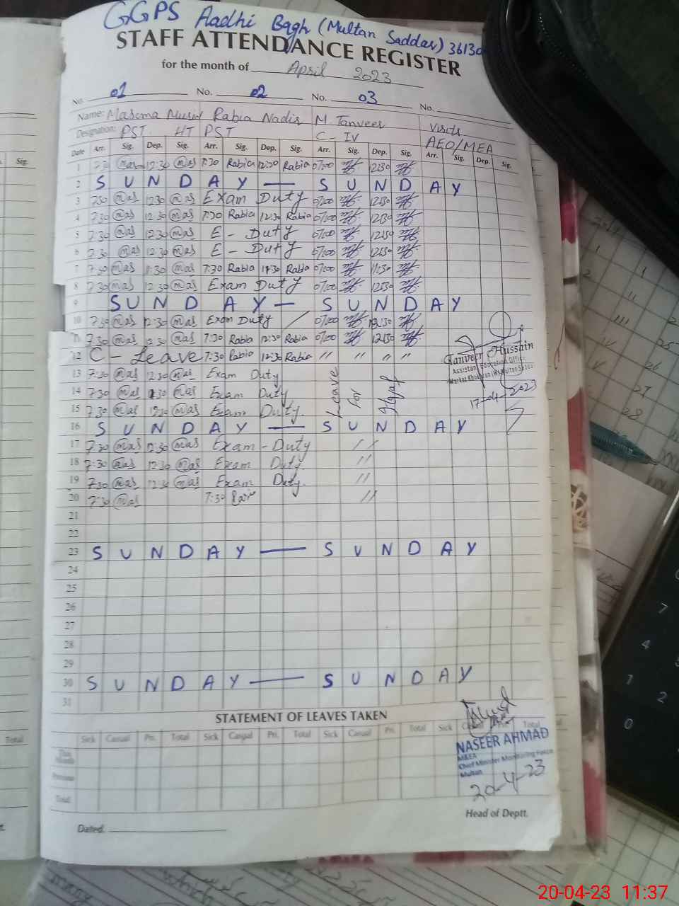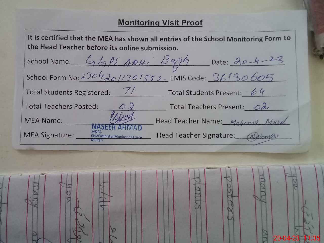 | Attendance Register | Head Teacher | MEA with School | Visit Proof |