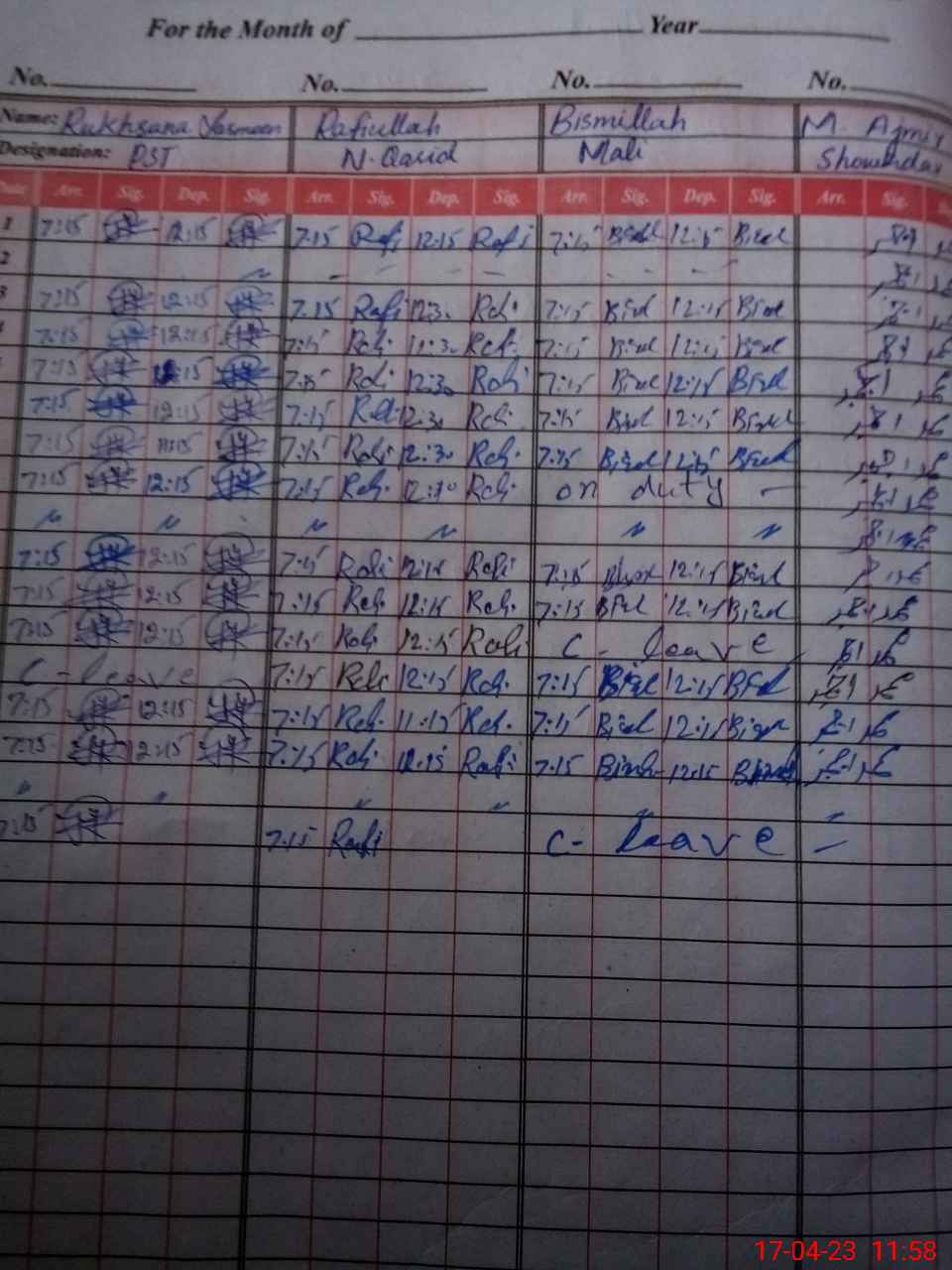 | CNIC | Full Name | Designation | R/C | Absence During Last Calender Month |