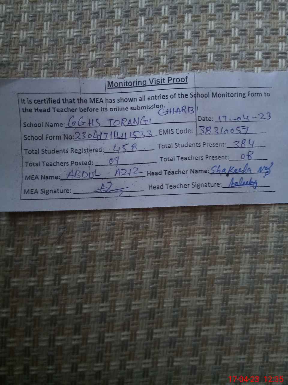 | Attendance Register | Head Teacher | MEA with School | Visit Proof |