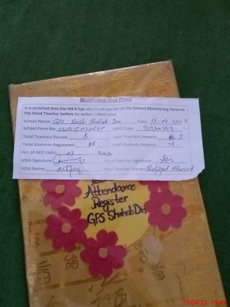 | Attendance Register | Head Teacher | MEA with School | Visit Proof |