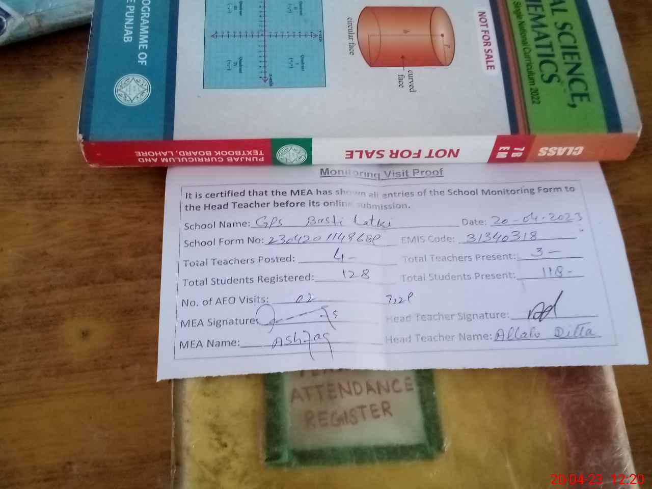 | Attendance Register | Head Teacher | MEA with School | Visit Proof |