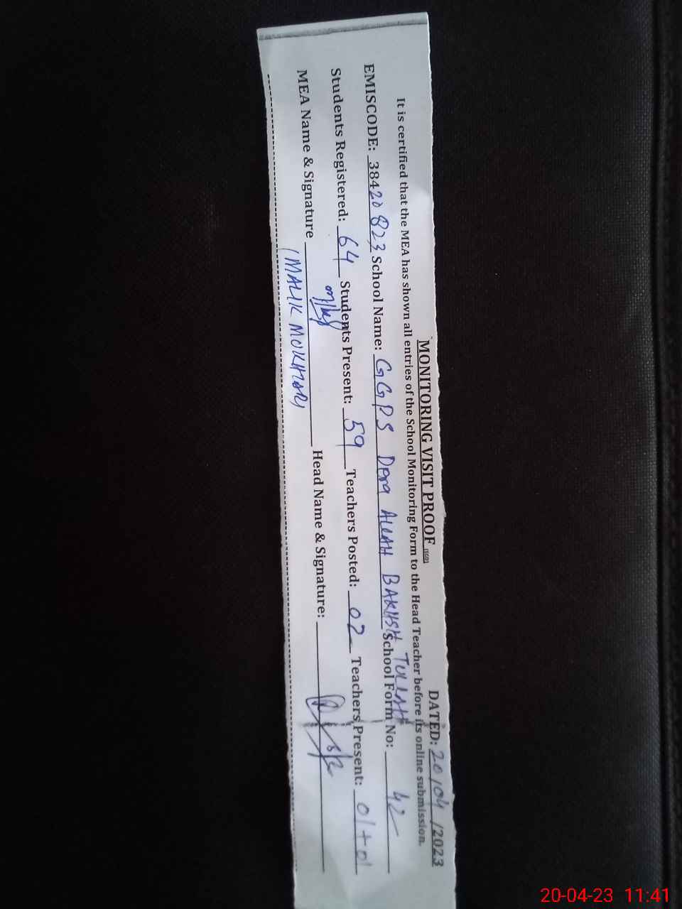 | Attendance Register | Head Teacher | MEA with School | Visit Proof |