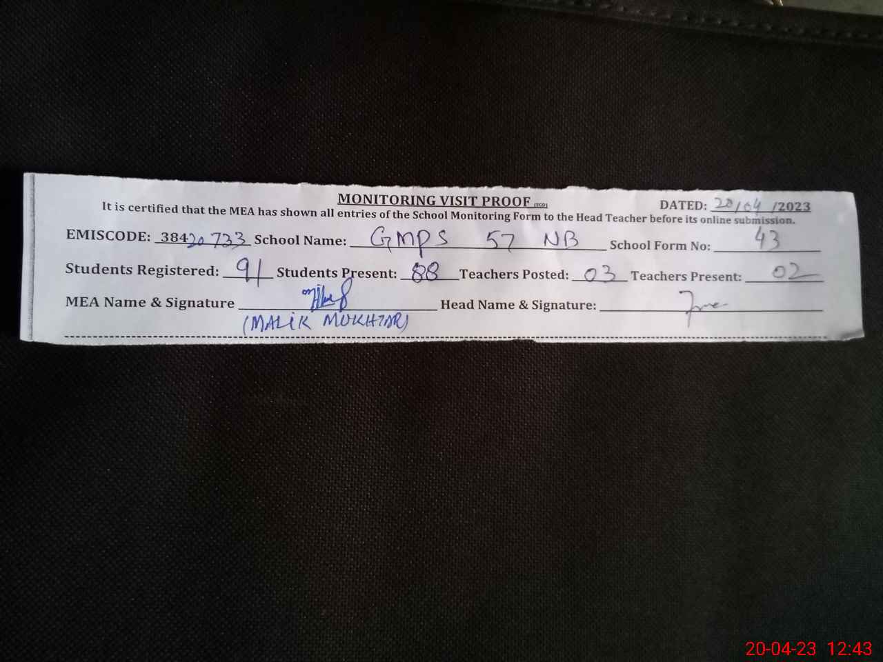| Attendance Register | Head Teacher | MEA with School | Visit Proof |