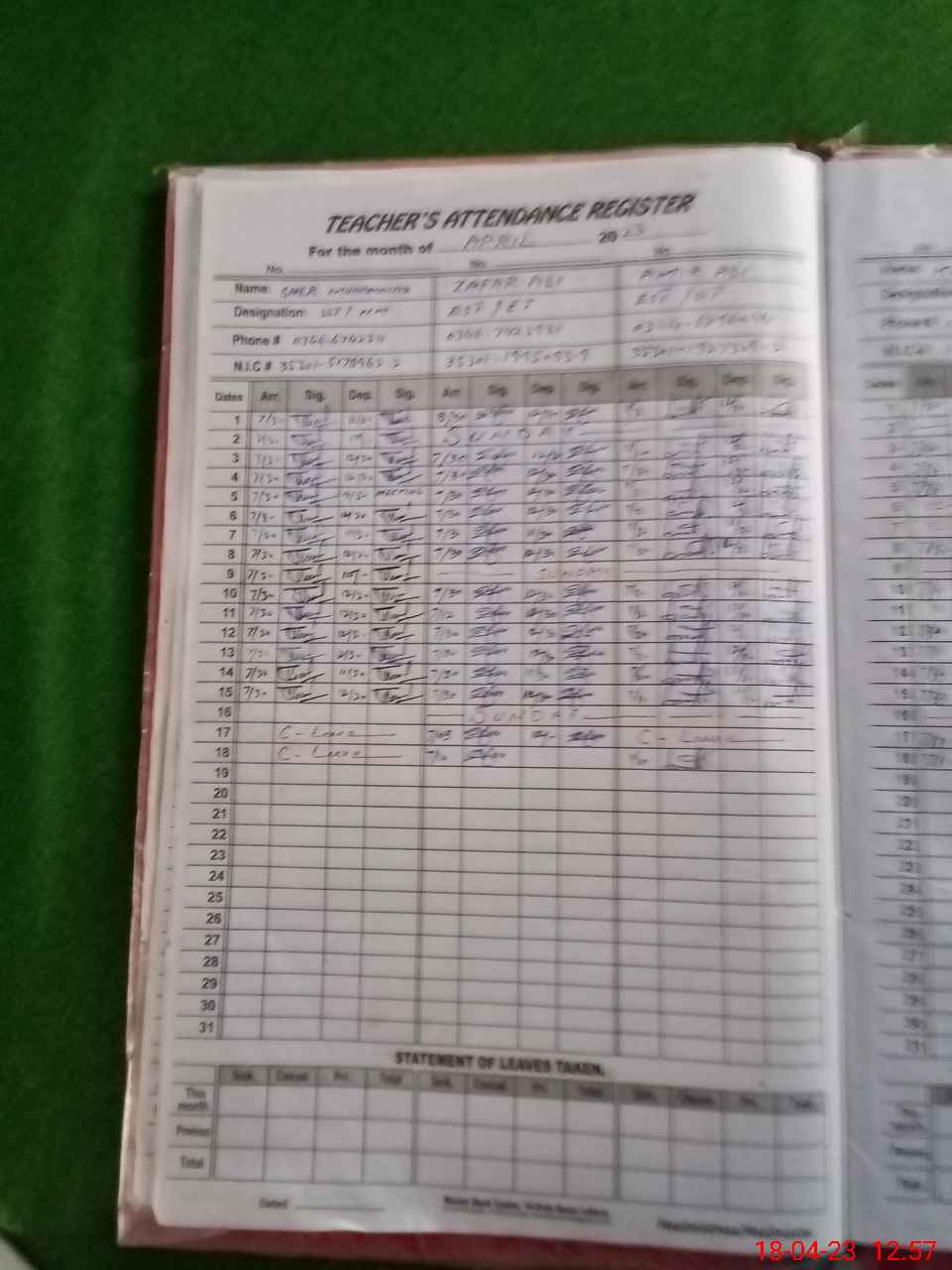 | CNIC | Full Name | Designation | R/C | Absence During Last Calender Month |