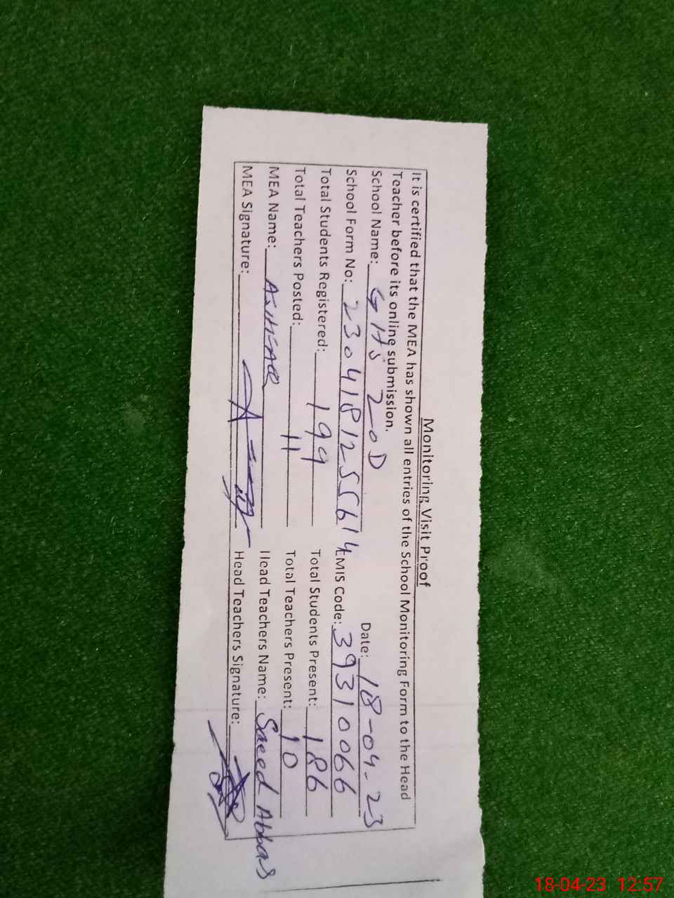 | Attendance Register | Head Teacher | MEA with School | Visit Proof |