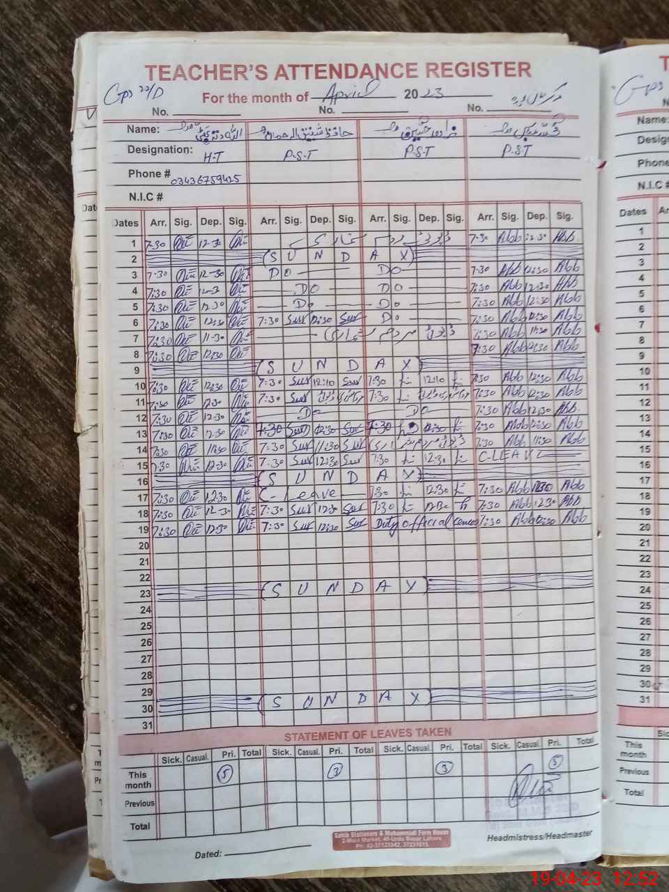 | Name: Mu**** Sh**** Designation: (School Headmaster's/Headmistress's) PST Phone/Cell Number: 03**** |