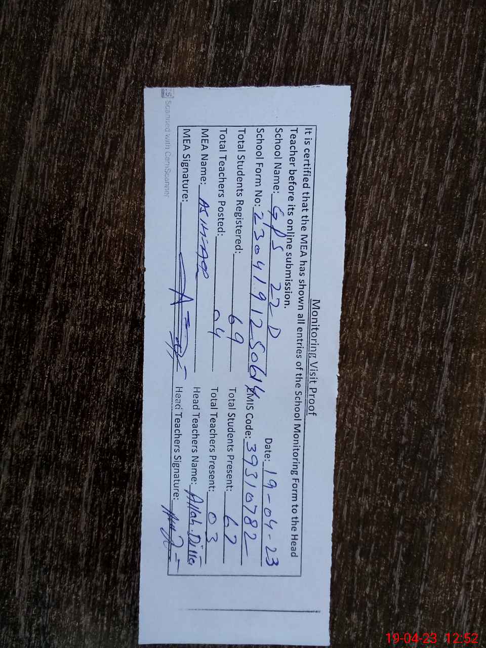 | Attendance Register | Head Teacher | MEA with School | Visit Proof |