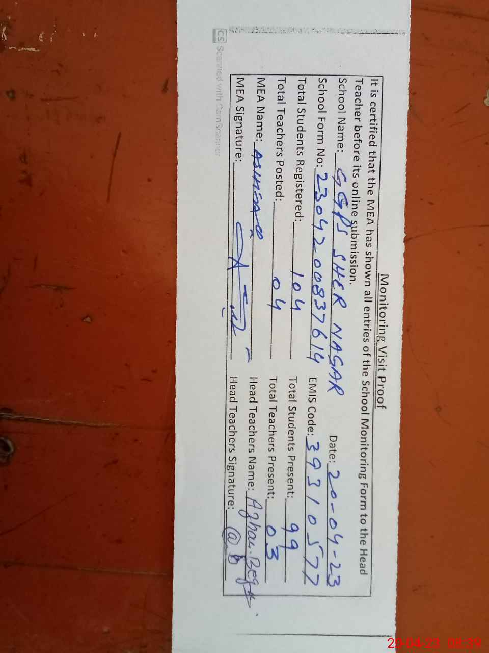 | Attendance Register | Head Teacher | MEA with School | Visit Proof |