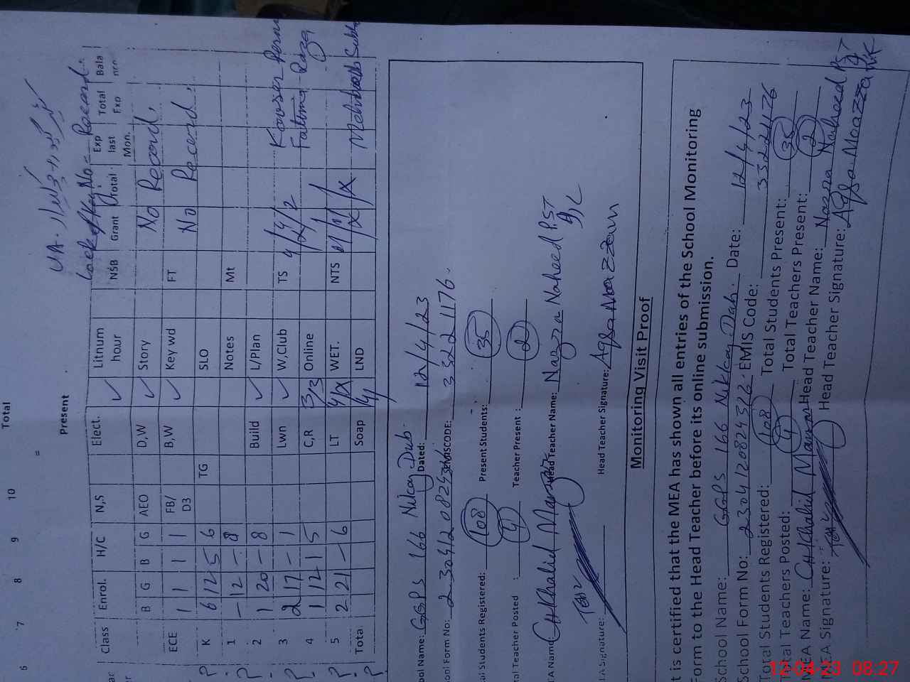 | Attendance Register | Head Teacher | MEA with School | Visit Proof |