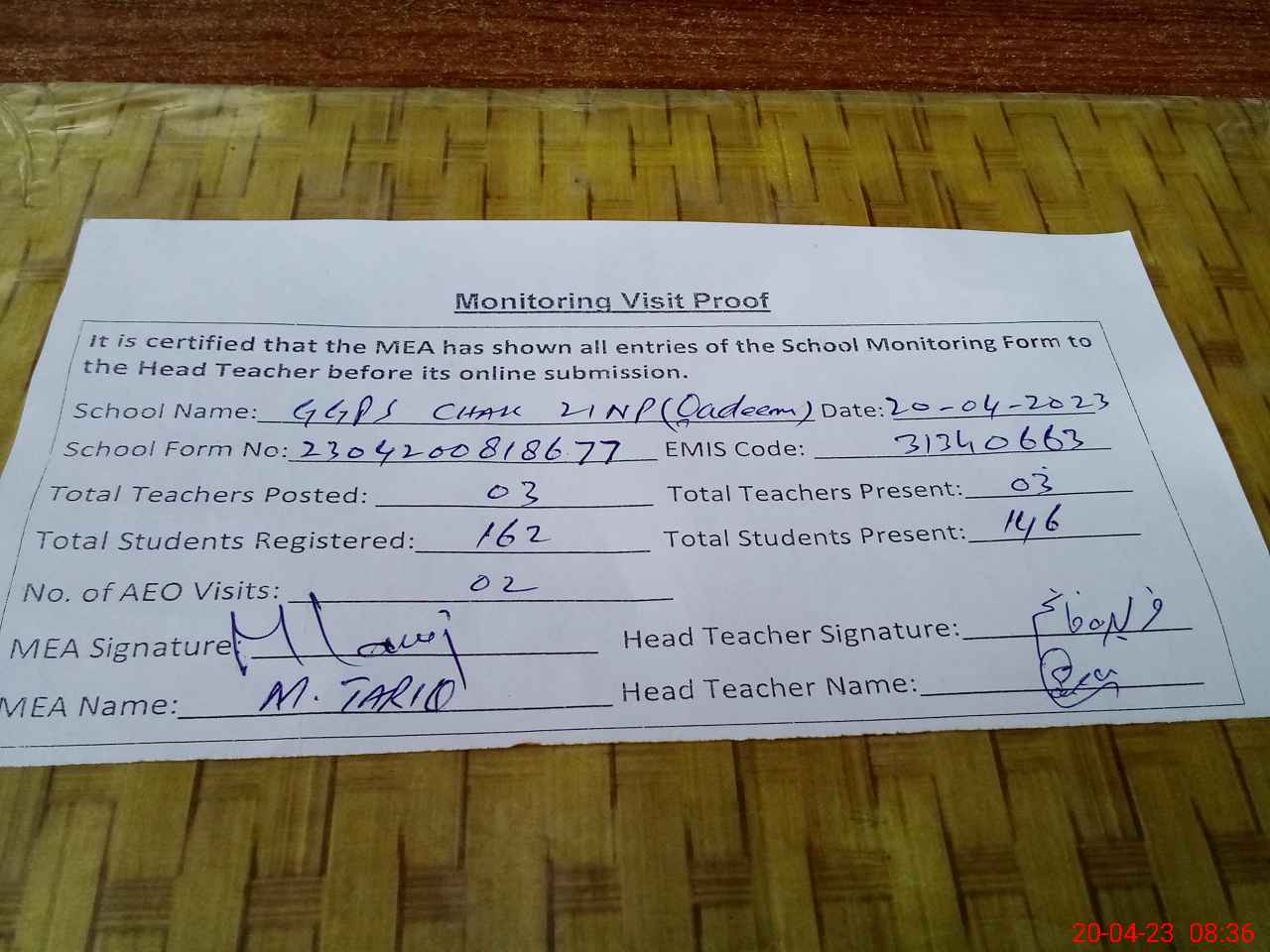 | Attendance Register | Head Teacher | MEA with School | Visit Proof |