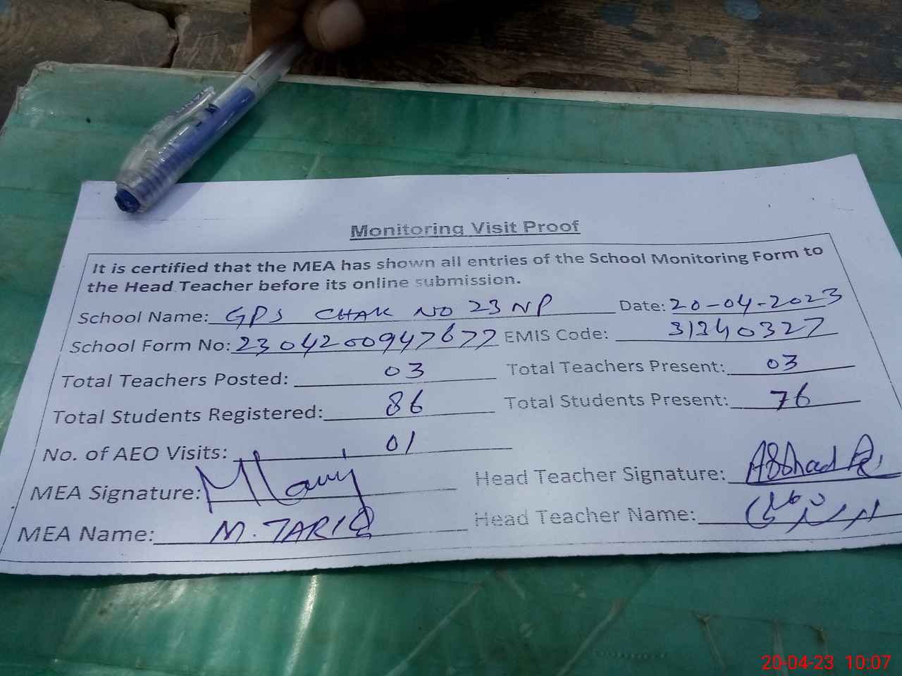 | EMIS Code: 31340327 | Name of School: GPS CHAK NO 23/NP | |||