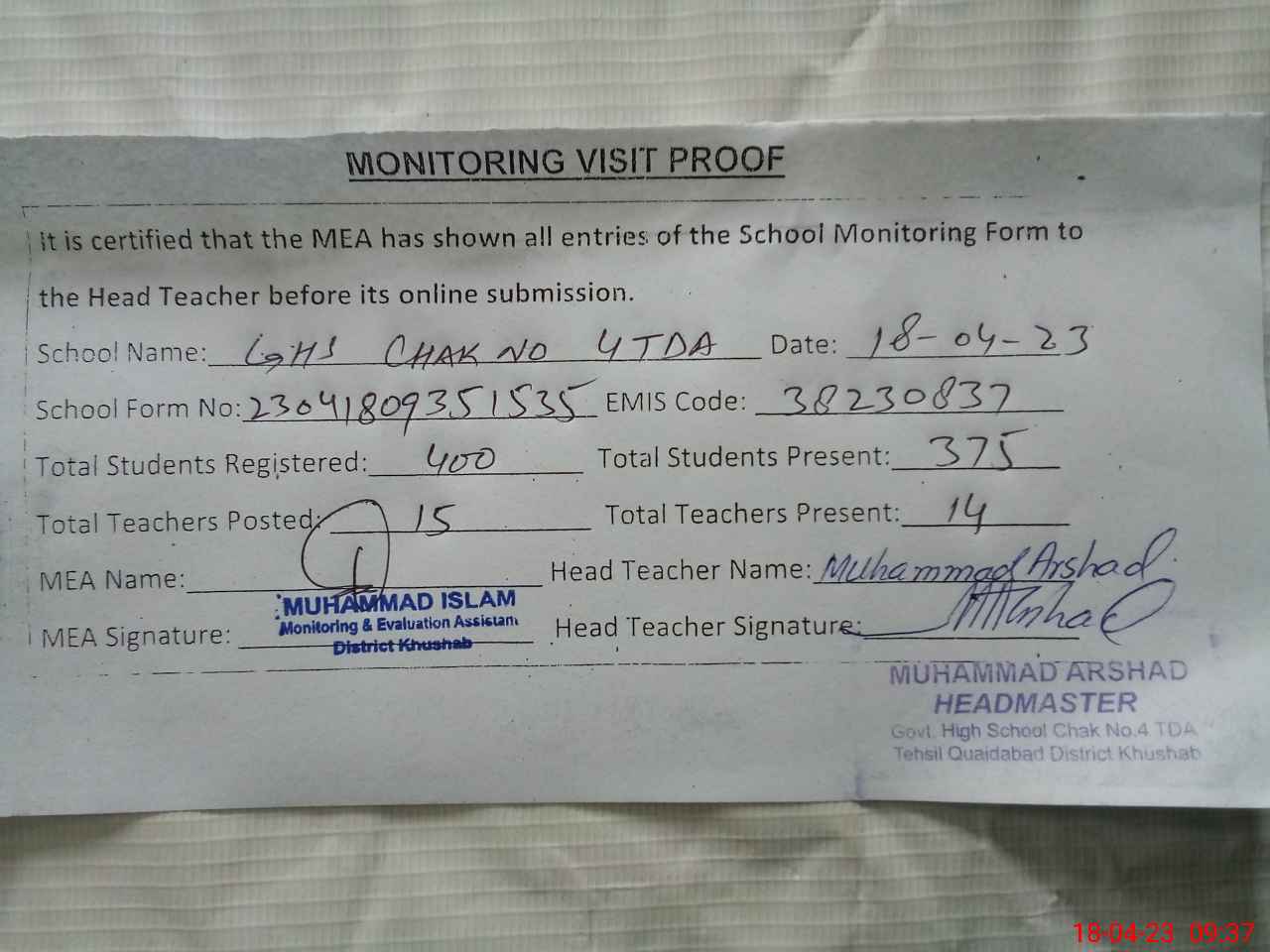 | EMIS Code: 38230837 | Name of School: GHS CHAK NO. 4 TDA | |||