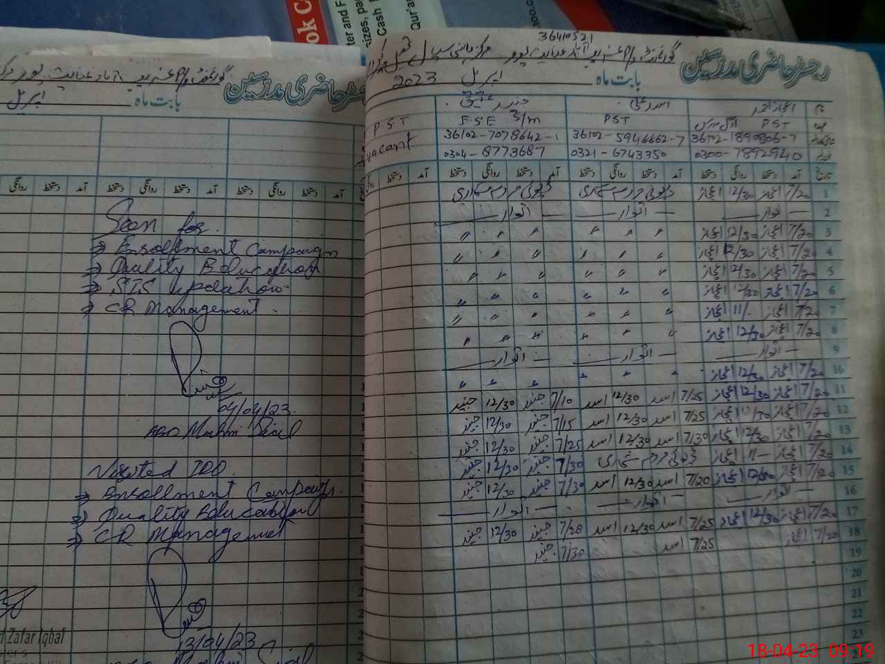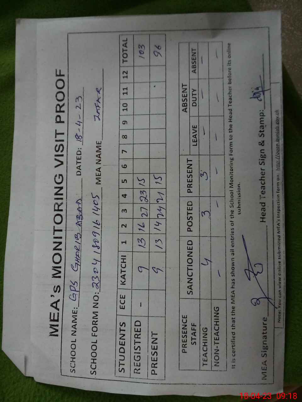 | Attendance Register | Head Teacher | MEA with School | Visit Proof |