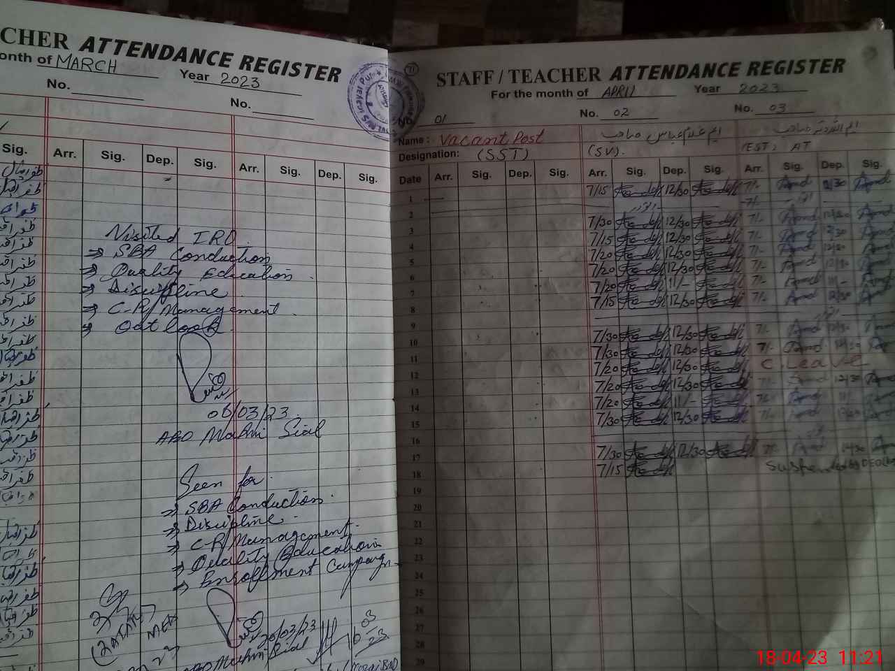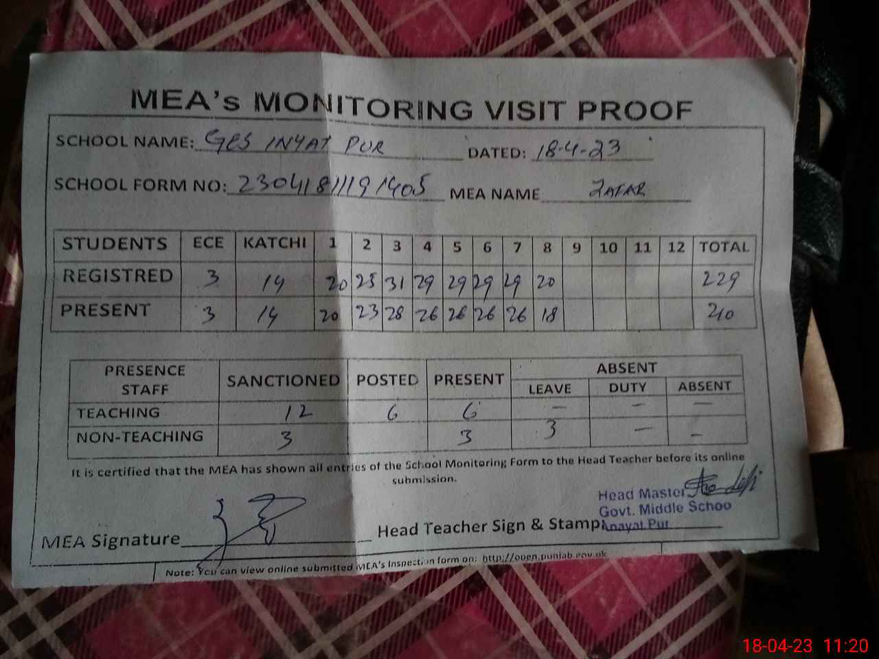 | Attendance Register | Head Teacher | MEA with School | Visit Proof |