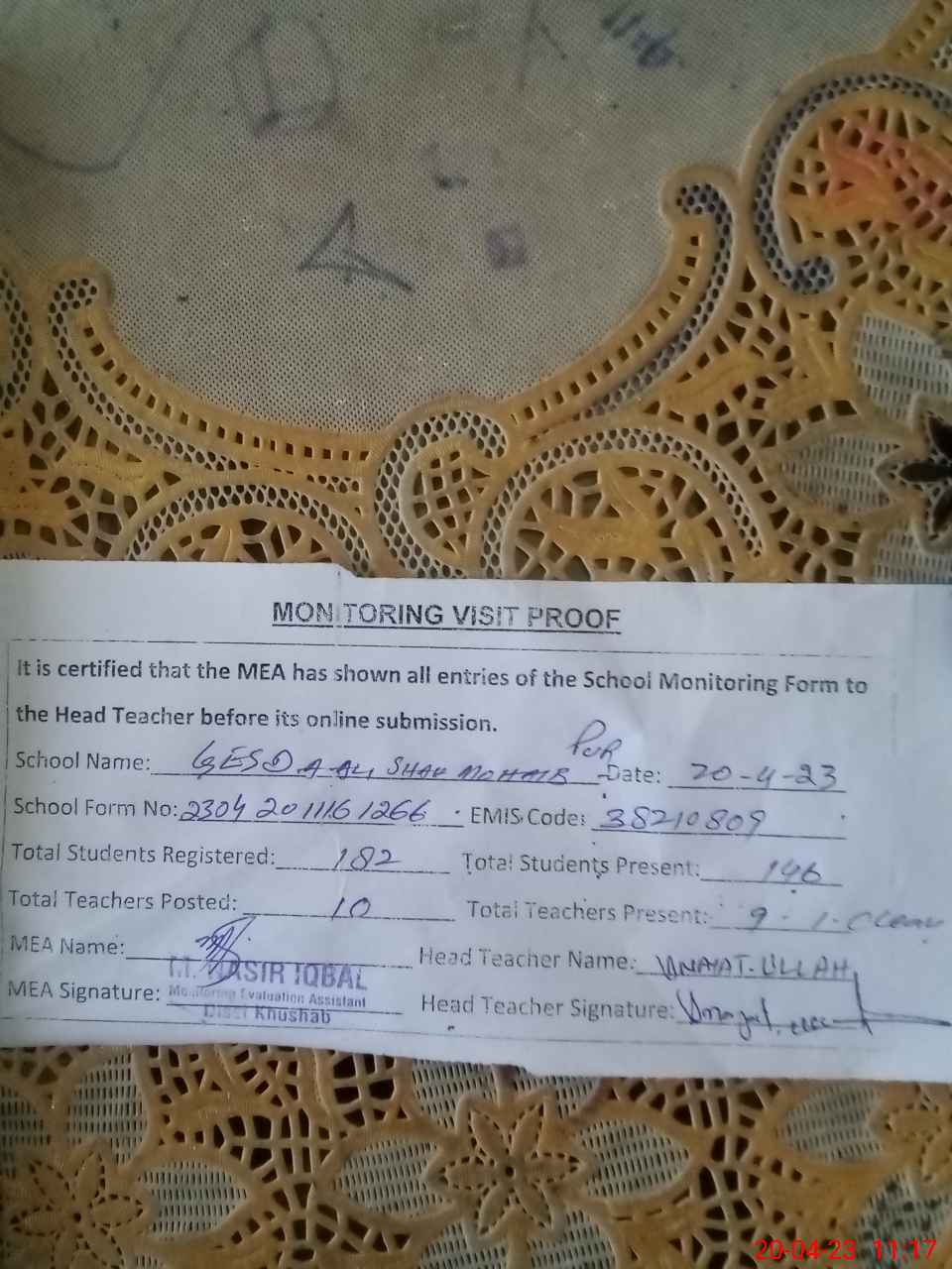 | Attendance Register | Head Teacher | MEA with School | Visit Proof |