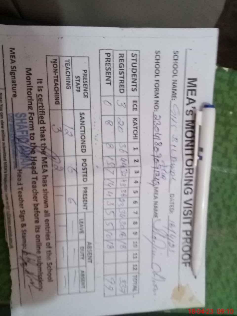 | Attendance Register | Head Teacher | MEA with School | Visit Proof |