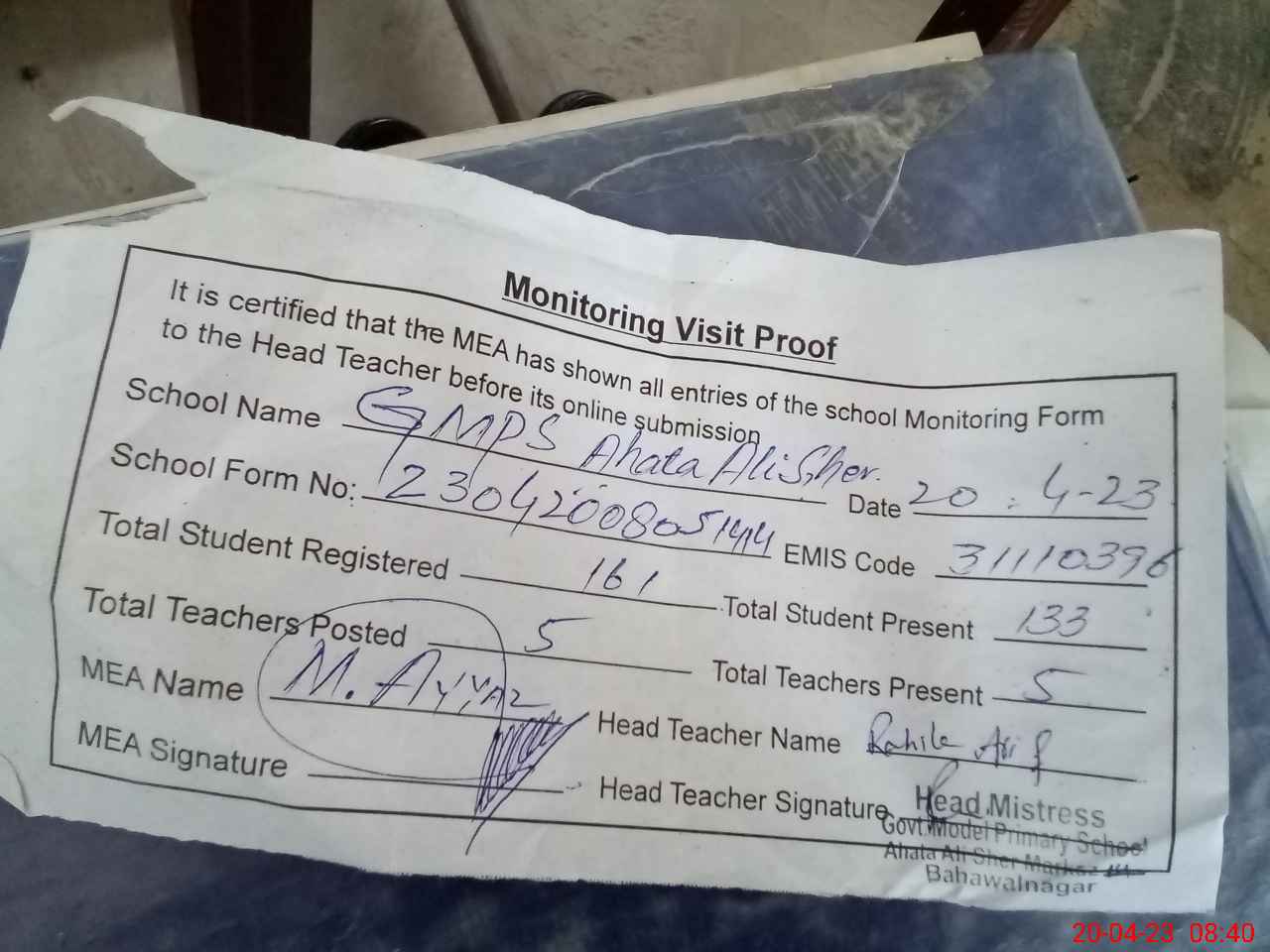 | Attendance Register | Head Teacher | MEA with School | Visit Proof |