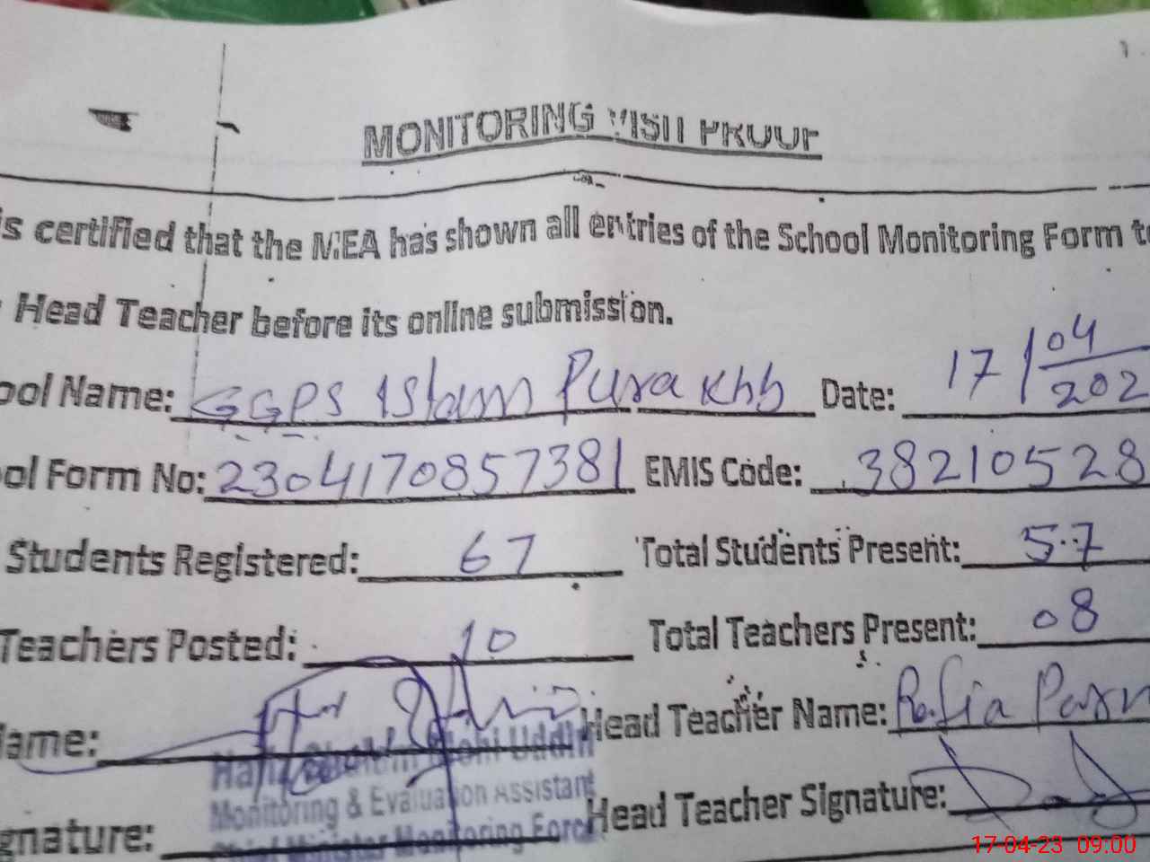 | Attendance Register | Head Teacher | MEA with School | Visit Proof |