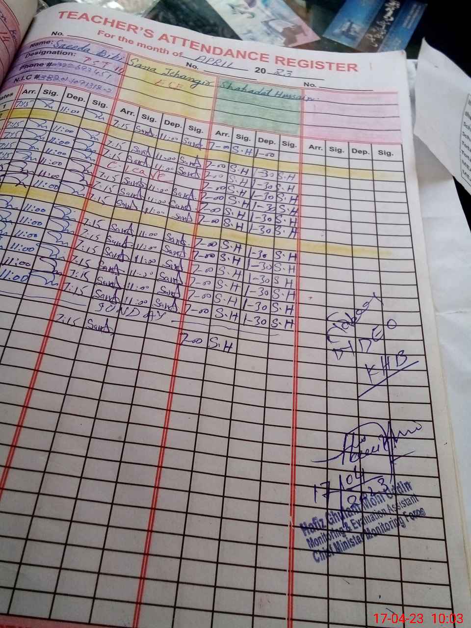 | CNIC | Full Name | Designation | R/C | Absence During Last Calender Month |