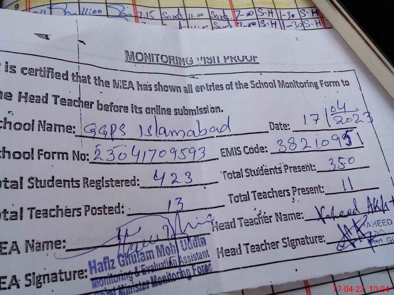 | Attendance Register | Head Teacher | MEA with School | Visit Proof |