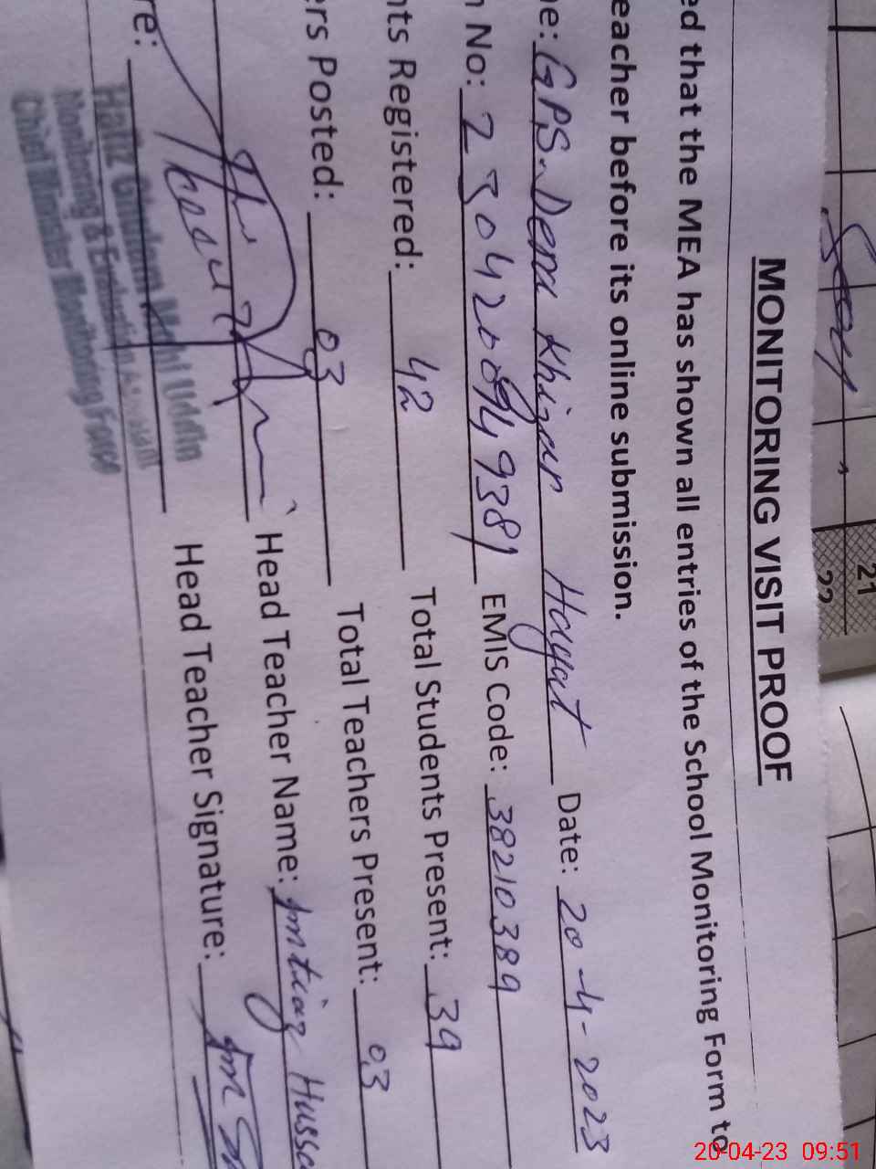 | EMIS Code: 38210389 | Name of School: GPS DERA KHIZAR HAYAT | |||