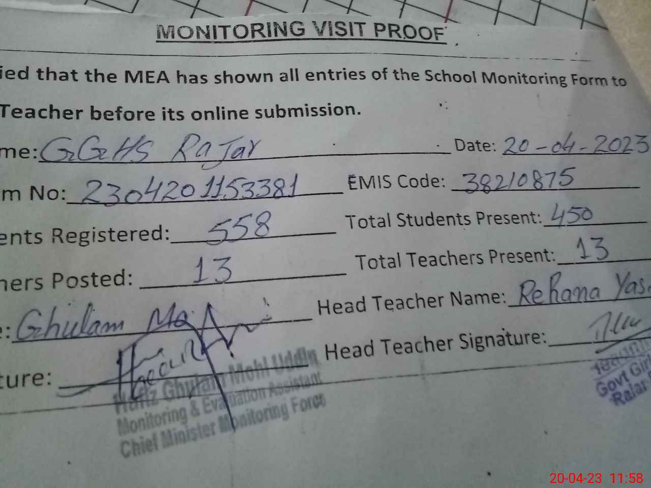 | Attendance Register | Head Teacher | MEA with School | Visit Proof |