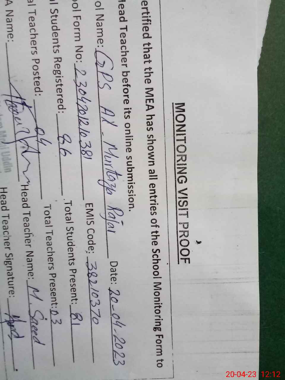 | EMIS Code: 38210370 | Name of School: GPS AL MURTAZA RAJAR | |||