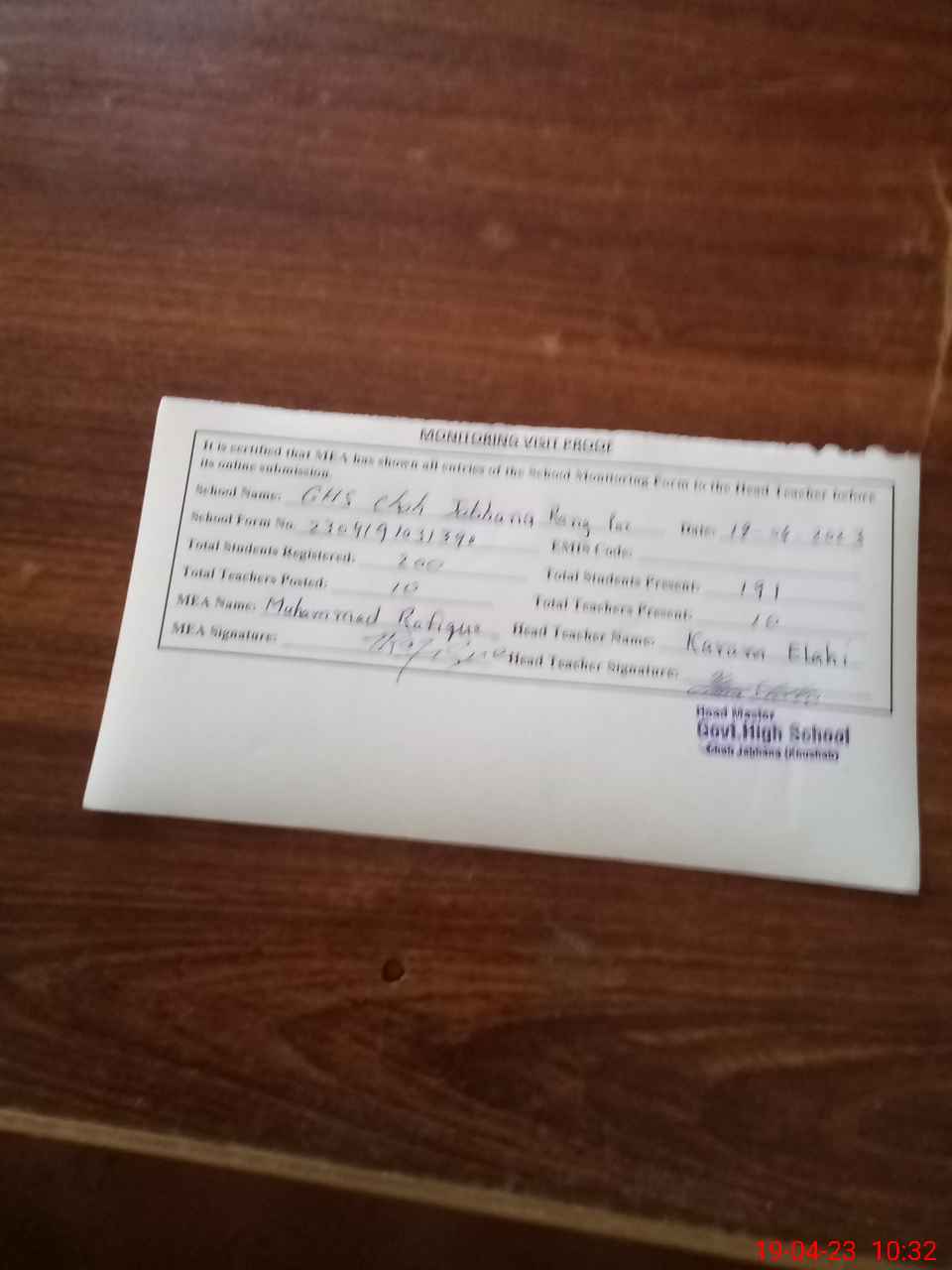 | Attendance Register | Head Teacher | MEA with School | Visit Proof |